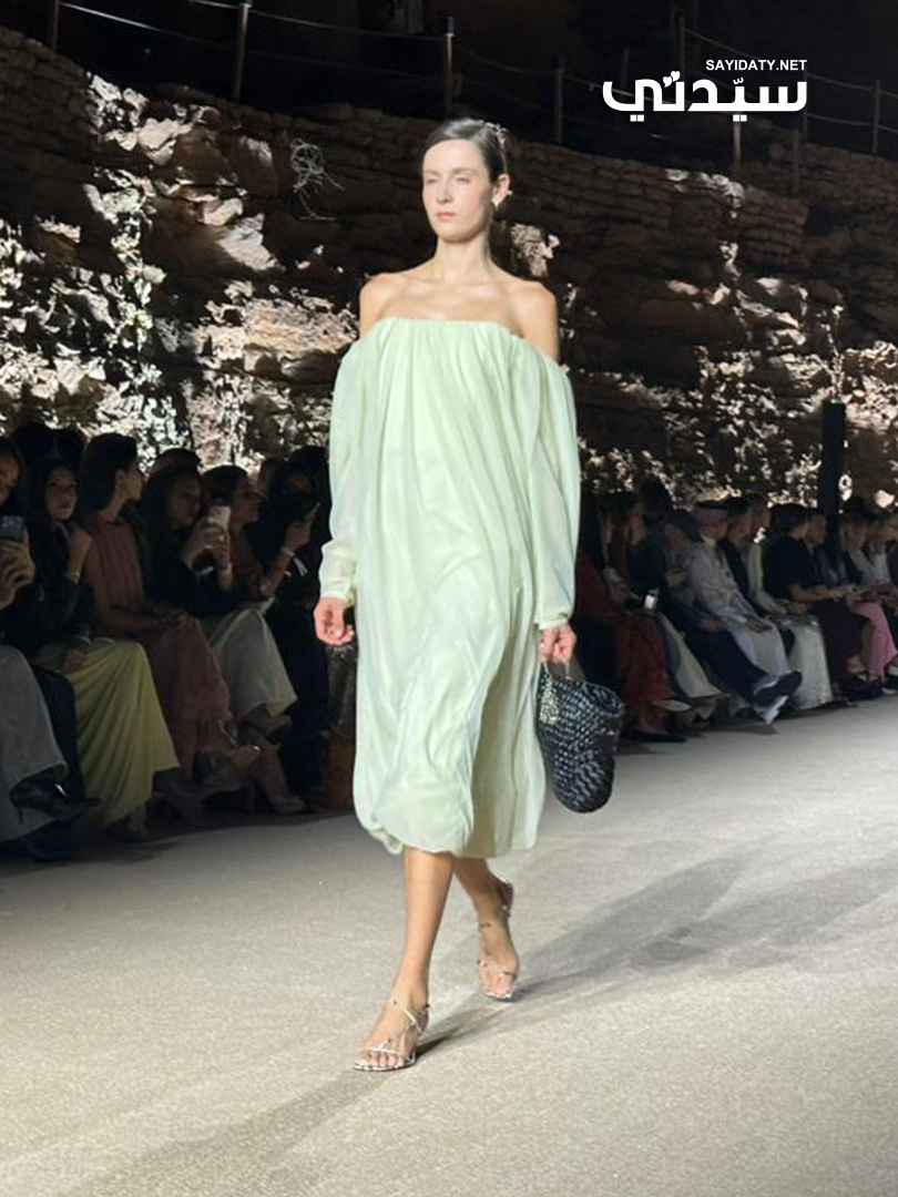كما ظهر فستان ميدي باللون الأخضر الباستيلي الهادئ، بقصة أكتاف منسدلة وأكمام طويلة، مما يجسد الأنوثة المرحة والمريحة في آن واحد.