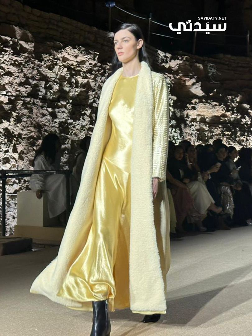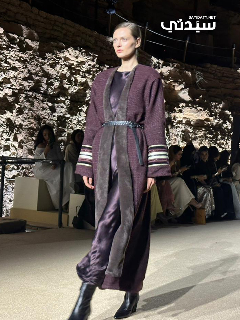 عكست بعض الإطلالات جذور العلامة العربية بلمسة عصرية وفاخرة للمعطف الشتوي الطويل، مثل هذا التصميم باللون العنابي الداكن، مزينة بلمسات زخرفية على الأكمام، وتم تنسيقها مع فستان حريري متطابق اللون وحزام لتحديد الخصر، فهذه الإطلالة تمزج بين دفء الأقمشة الشتوية وفخامة الألوان العميقة، مقدمة أسلوباً راقياً للارتداء اليومي الفاخر.