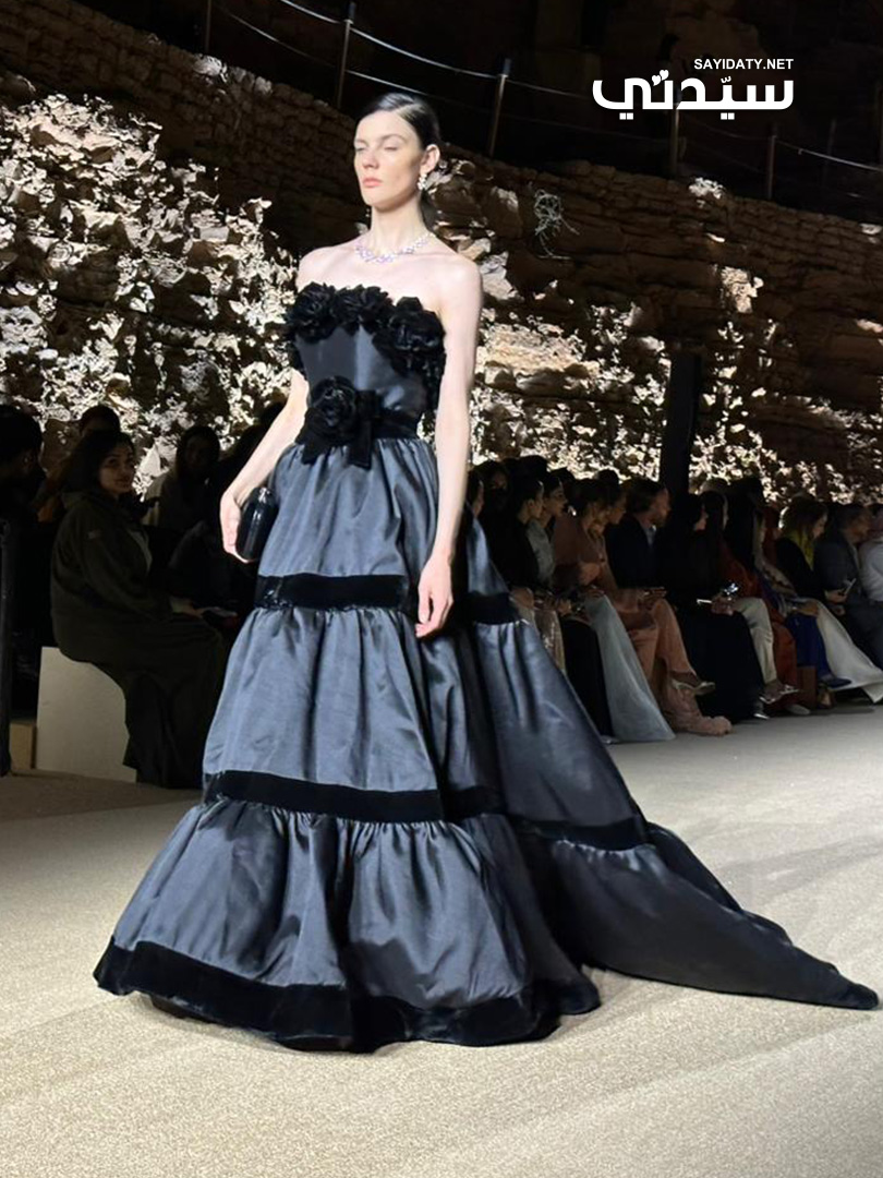ظهرت فساتين ذات قصات مميزة، مثل هذا الفستان الأسود بطبقات واسعة، يتميز بتموجات قماش التفتا أو الساتان، بلمسة المخمل الفاخرة، مع صدر مزين بالورود السوداء البارزة، وذيل طويل ينسدل من الخلف، مما يعيد سحر اللون الأسود الكلاسيكي بقصة جذابة ومفعمة بالأنوثة.