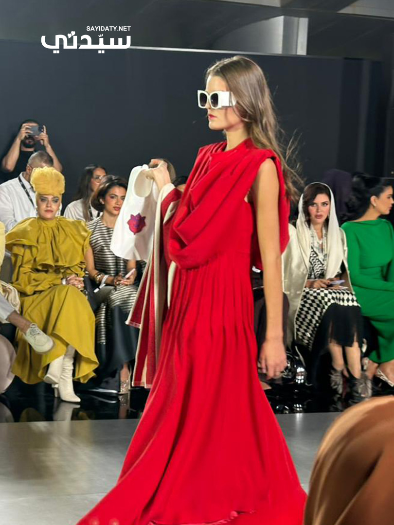 كما برزت الإطلالة ذات اللون الأحمر القوي، بقصتها المنسدلة التي تشبه العباءة العصرية، مع أكسسوارات بيضاء لافتة، لتؤكد على جرأة المصممة في تحدي الألوان الكلاسيكية بأسلوب عصري.