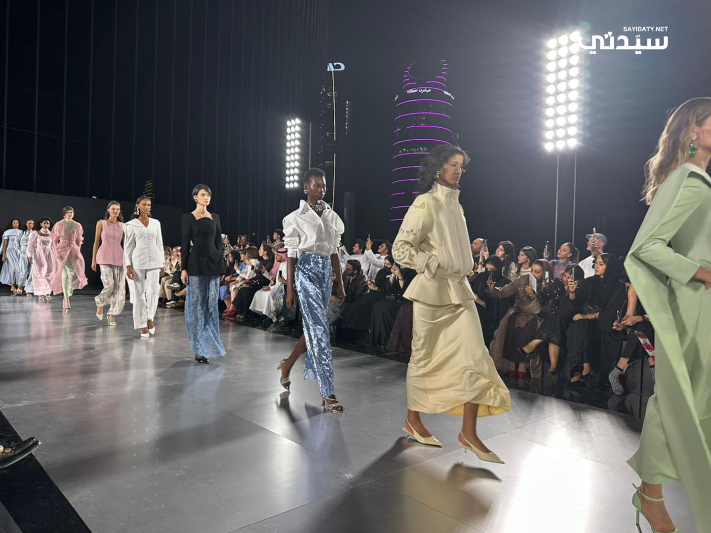 برز في العرض استخدام الأقمشة الشفافة كالشيفون والدانتيل مع تفاصيل دقيقة في القصّات والنقشات، ما منح التصاميم خفة وأناقة في الوقت نفسه، وتنوّعت لوحة الألوان بين الدرجات الحيادية الكلاسيكية مثل البيج والعاجي، والألوان الناعمة كالباستيل الوردي والأزرق السماوي، لتقدّم مزيجاً متناغماً من البساطة والترف.