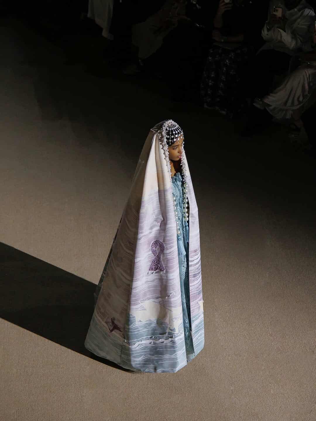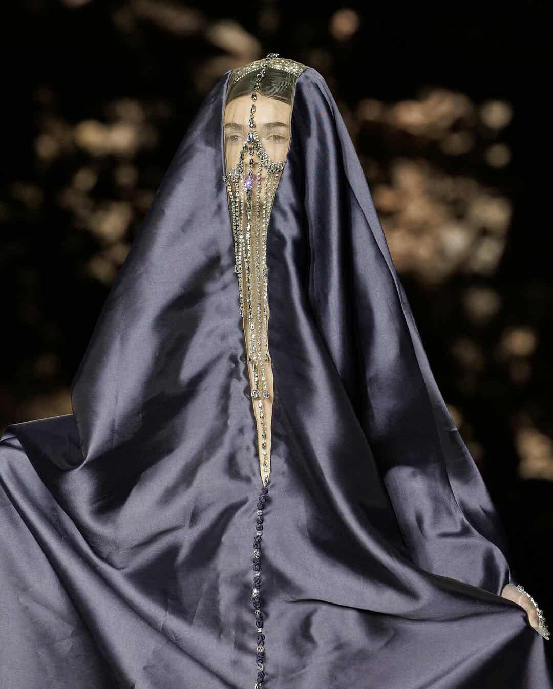 احتفت تيما عابد Tima Abid بالتراث السعودي بإحيائها البرقع الحجازي في شكله التقليدي، فلم تتردد في إرسال إحدى عارضاتها إلى المنصة بقفطان ساتان أزرق داكن مصمم بغطاء رأس موصول ببرقع شفاف مزدان بالكريستالات والخرز اللامع ليكشف قسمًا كبيرًا من الوجه، لقد كان مفاجأة العرض الذي ارتكز على الفساتين الدرامية وتمحور حول فكرة "الفوضى" المتجسدة في تصاميم استثنائية أثبتت المصممة السعودية من خلالها أن الجرأة والرقي يمكن أن يجتمعا.