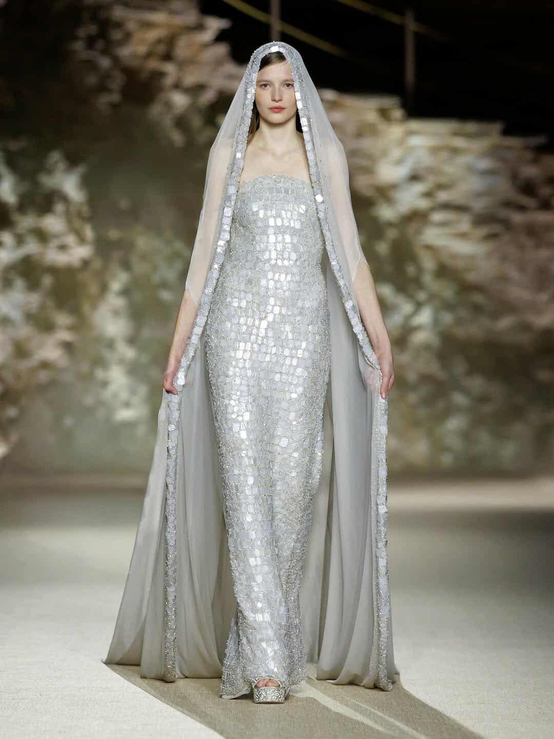 وفي المجموعة نفسها قدمت المصممة السعودية تصميمًا مشابهًا للسهرة يناسب العروس مغلفًا بالكامل بالقصاصات اللامعة ومنسقًا مع طرحة شيفون تصل إلى الأرض مزدانة بنفس التطريز.