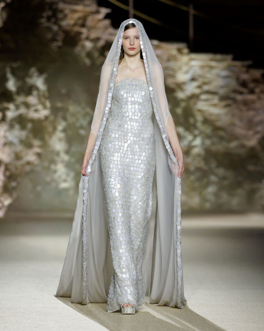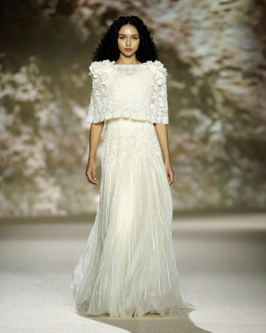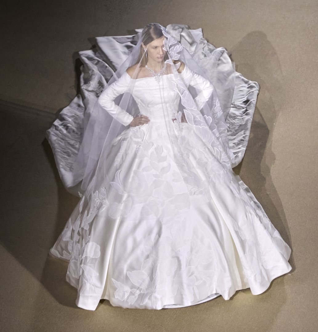 إذا كنت تقيمين حفل زفافك في قاعة مقفلة ضخمة فأنت بحاجة إلى هذا الفستان المصنوع من الساتان دوشيس المطبع بالورود الكبيرة ويتسم بياقة مربعة أنثوية منسدلة قليلاً عند الأكتاف مع أكمام طويلة ويتسم بقصة منفوخة أميرية، من تصميم أشواق المرشد، وهو منسق مع طرحة شفافة وطويلة من الفوال تغطي الوجه. لقد حظي الفستان لدى ظهور على المنصة ضمن أسبوع الأزياء في الرياض بإعجاب كبير.
