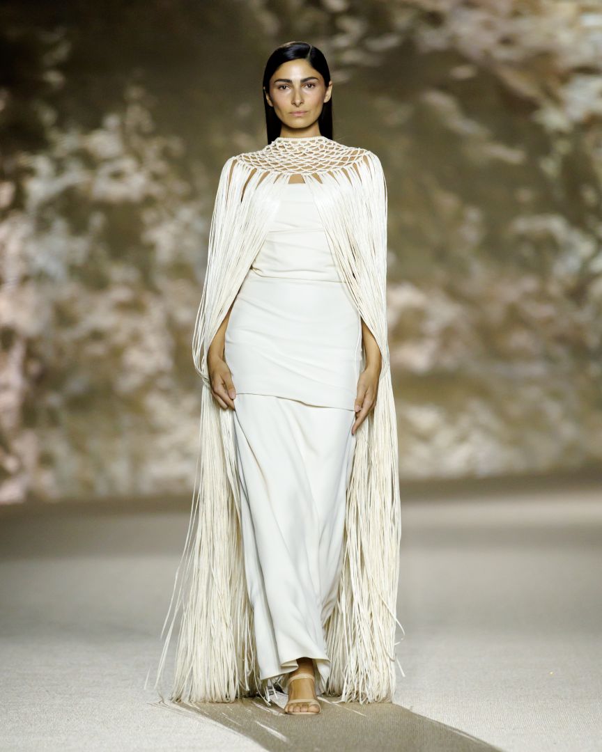 أو يمكنك اختيار هذه البدلة المصنوعة من الكريب الأبيض بطابع مونوكروم راقٍ من تصميم دار دنانير Dananeer، وقد تم إطلاقها في اليوم الرابع من أسبوع الأزياء في الرياض. ويمكنك تنسيق صندل أبيض بكعب عالٍ ورفيع واعتمري قبعة عصرية تبدو كعصبة للرأس أو توربان، واكتفي بأقراط الثريا الكريستالية الضخمة.