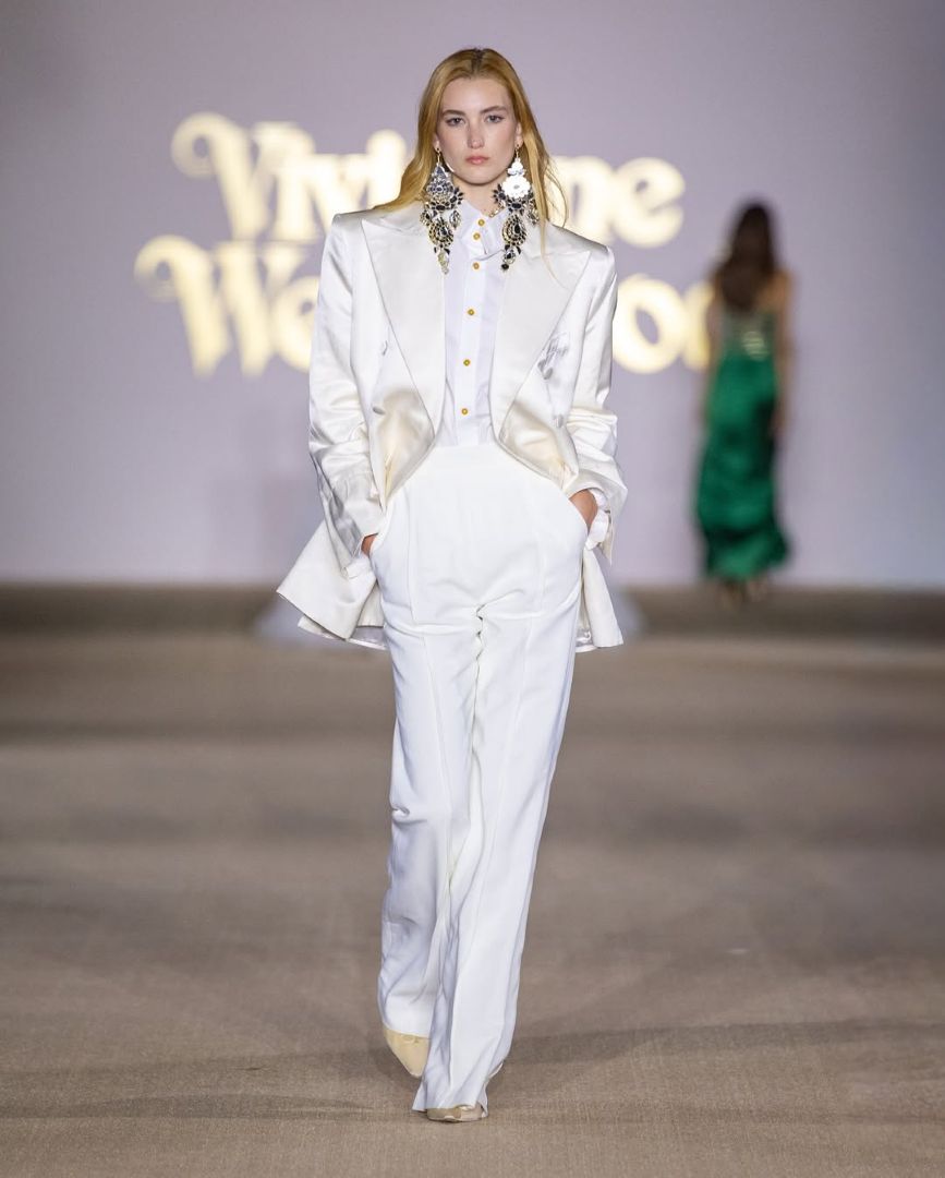 إذا كنت من عاشقات النجمة بيانكا جاغير Bianca Jagger، وتفكرين في ارتداء بدلة لزفافكِ، فالخبر السار هو أن الخيارات المتاحة لا حصر لها حالياً. سواءً كنتِ ترغبين في قطعة واسعة أو ضيقة، تنورة أو سروال، كريمي أو أبيض ناصع، فهناك الكثير لتختاري منه، سواءً من ماركات فساتين الزفاف أو دار فيفيان ويستوود Vvienne Westwood، الأمر كله يتعلق بالقصّة والقماش وطريقة تنسيقها، فالبدلة بحد ذاتها قطعة مميزة. لذا حافظي على بساطة أكسسواراتكِ، مع حذاء أنيق بسيط ذي أشرطة واكتفي بأقراط بارزة.
