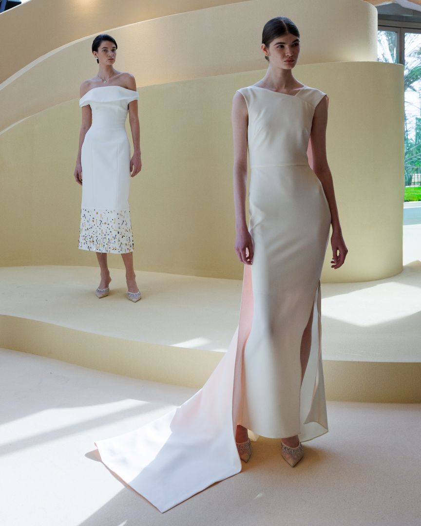 ولخيار عصري لحفل زفاف على شاطئ البحر، اختاري هذا الفستان من تصميم فاطمة عبد القادر، التي نفذت من الكريب الحريري الفستان العاجي المنسدل بشكل مستقيم ويتميز بياقة غير متجانسة القصة من الأعلى، وهو متصل بذيل طويل مبطن بقماش باللون الزهري المبودر لإضفاء طابع رومانسي. يمكنك انتعال حذاء من التول القاسي المطرز بالكريستال، وتوّجي إطلالتك بتسريحة شينيون مشدودة إلى الوراء..