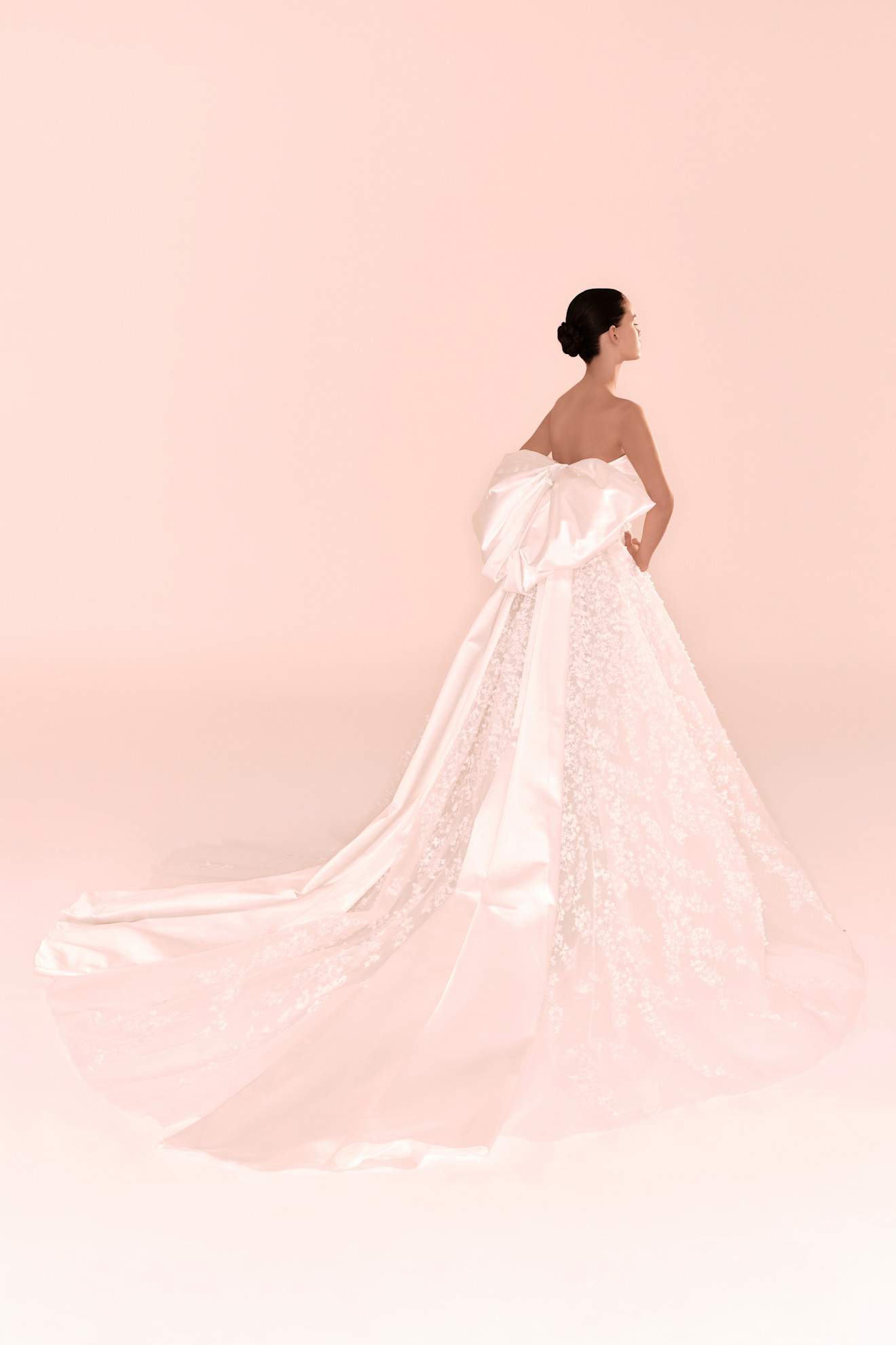 لن تكتفي عروس خريف 2026 بتزيين أطراف الأكمام أو الصدر بالفيونكات الصغيرة، بل سيلجأن إلى الأحجام الكبيرة المستقرة على الظهر؛ سعياً للحصول على إطلالة خاطفة للأنظار، فقد تفنن المصممون في توظيف ذلك الأكسسوار الأنثوي بطرق مبتكرة، ولكننا وقفنا كثيراً لنتأمل جمال الفستان الموقع من المصمم زهير مراد Zuhair Murad، فقد تميز بأكتافه المكشوفة والورود المحبوكة بدقة عالية التي تزينه بالكامل، والفيونكة الساتان الكبيرة تزين الظهر لتتدلى أطرافها لتلامس ذيل الفستان، إبداع فني منقطع النظير سيلهم عروساً تخطط لحفل زفاف أسطوري في فندق فخم.