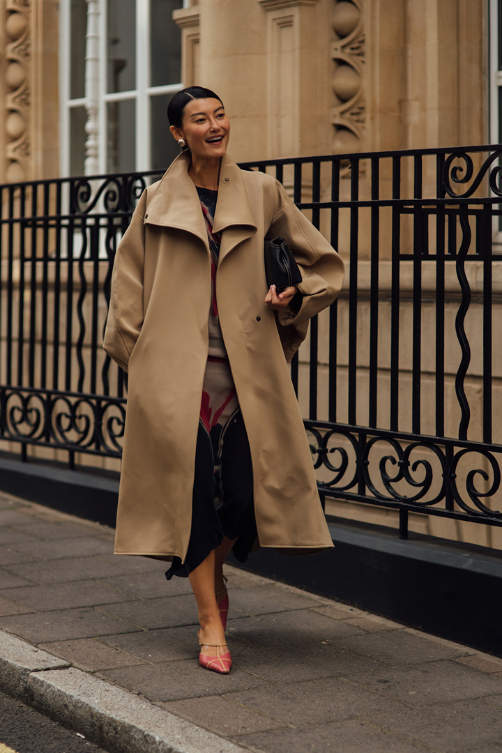 يشتهر الترانشكوت بصرامته وألوانه الرصينة، ولكن يبدو أن صناع الموضة أرادوا أن يطبعوه هذا الموسم بلمسة أنثوية، فقدموه بأكمام منفوخة وقصات أكثر انسيابية، ما رأيك في تنسيق هذا النمط مع الفساتين الميدي المطبعة لتحصلي على الطلة الأنثوية المنشودة؟ وانتعلي حذاءً مدبباً أحمر، واحملي حقيبة كتف أو Pouch سوداء.
