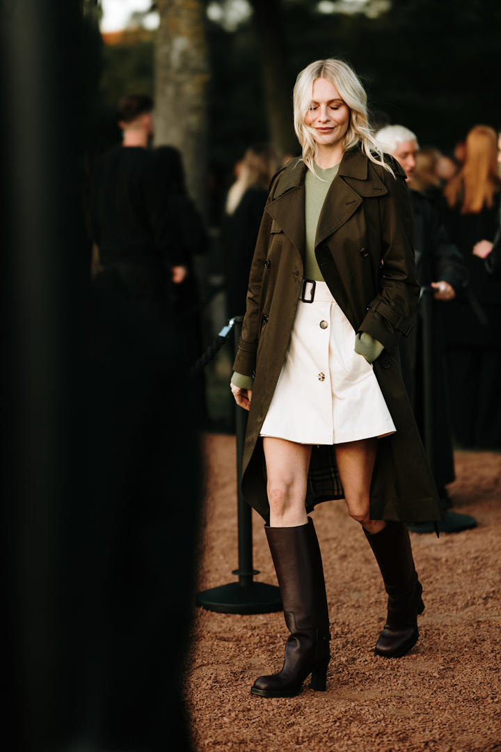 تشمل لوحة ألوان خريف 2025 النغمات الفاتحة مما يتيح لنا فرصة أكبر لتنسيق ثنائيات غير متوقعة، فعلى سبيل المثال يمكنك الاستعانة بالتنانير البيضاء هذا الموسم وتنسيقها مع الكنزات أو المعاطف ترابية اللون، ستتحمسين للفكرة أكثر عندما تشاهدين هذه الطلة التي رصدناها في شوارع باريس خلال أسبوع الموضة، والتي تألفت من معطف ترنش كاكي وكنزة محبوكة باللون الأخضر النعناعي وتنورة قصيرة A Line بيضاء، لقد جاء البوت الطويل البني الداكن كمتمم رائع لهذه الطلة الخريفية الأنيقة.