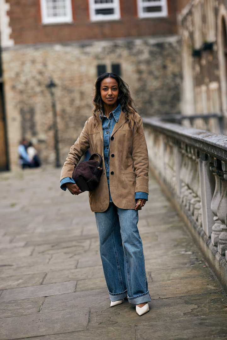 ليس هناك أجمل من الألوان الخريفية الدافئة لتبرزي جمال الدنيم الأزرق، لا سيما الجملي بمختلف تدرجاته، لذا وظفي البليزر السويد الطويل في تعزيز فخامة الطاقم الجينز المؤلف من قميص متوسط الطول وبنطلون Straight طويل بحافة مطوية، وأكملي اللوك الخريفي بحقيبة سويد بنية داكنة، أما الحذاء يفضل أن يكون Pointed باللون الأسود أو الجملي.