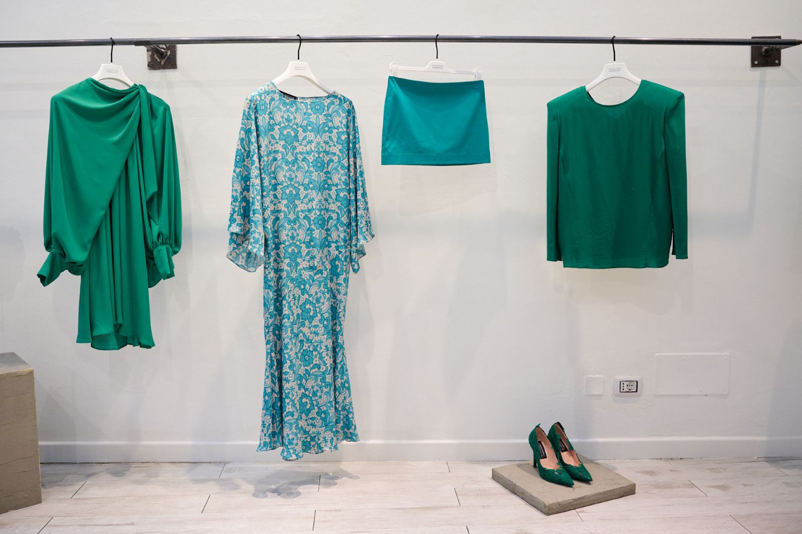 التنسيقات اللونية: ابتكري إطلالة راقية بارتداء تنورة ميني باللون الأزرق المخضر مع بلوزة حريرية باللون الفيروزي معًا.
