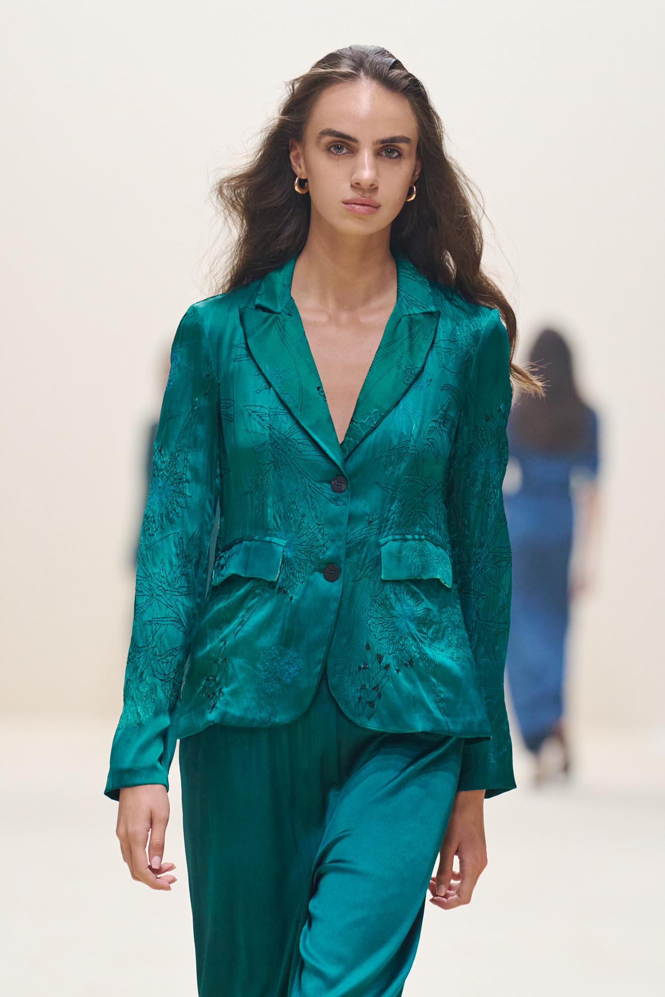 اختاري خامة الحرير لإبراز جاذبية هذا اللون: نسقي الأزرق المخضر بطابع مونوكرومي على شكل زي بيجاما مطرزة من الحرير، لإطلالة أنيقة ومميزة.