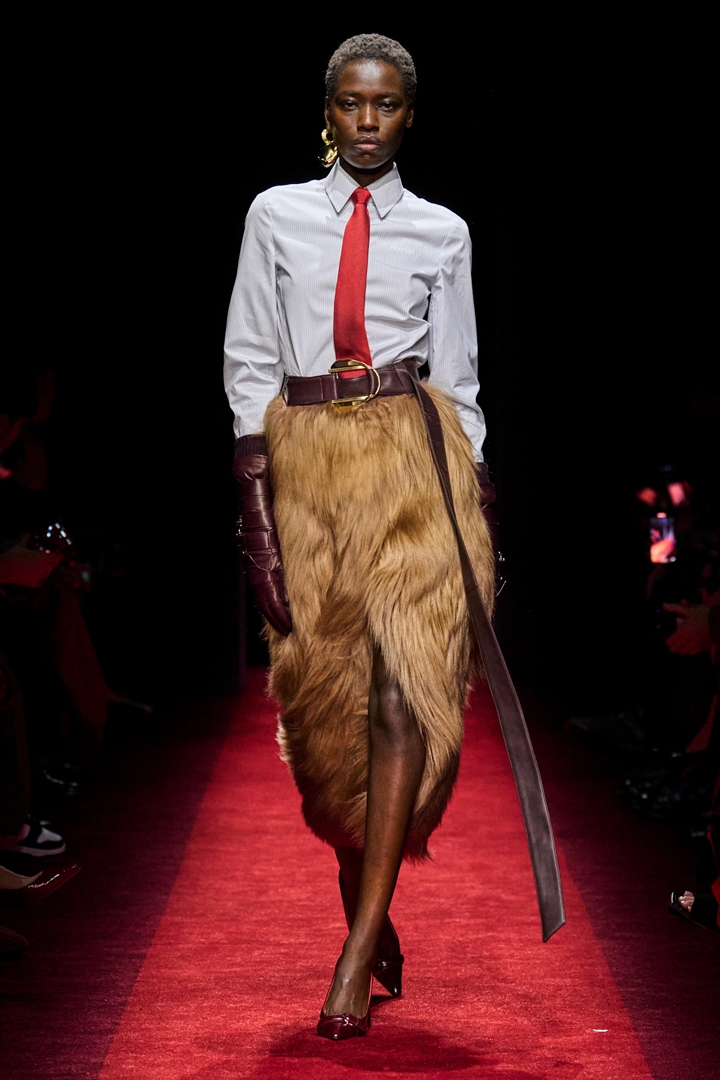 ليس بالأهداب وحدها ستتزين التنانير في خريف 2025، بل ستغطى بالفراء الناعم أيضاً، لقد منحتنا ماركة فيراري Ferrari نموذجاً رائعاً في تنسيق هذه القطعة الجريئة بشكل أنيق، بأن ارتدتها العارضة مع قطع رسمية مثل القميص المخطط ورابطة العنق الرجالية الرائجة، أكملي هذا اللوك الفريد بحذاء مدبب مزود بكعب عالٍ رفيع وحقيبة Pouch حمراء.