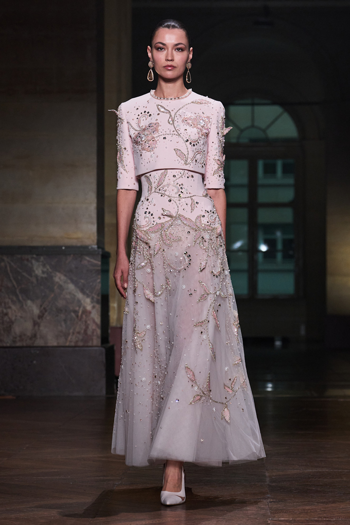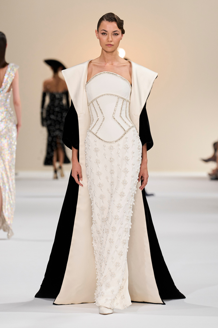 تقدم لنا عروض كوتور خريف 2025 أنماطاً منوعة من الفساتين السواريه التي تحمل طابعاً عصرياً سيعجب المرأة الأربعينية، ستحبين مثلنا الفستان المؤلف من قطعتين من مجموعة جورج حبيقة Georges Hobeika، أهم ما يميز هذا التصميم هو قصته المحتشمة على الرغم من فكرته الشبابية، فالبطن هنا مغطى بالكامل عكس ما نراه عادة في عروض المصمم اللبناني، وحتى إن كان تطريزه ناعماً، فلن يسمح لكِ بتنسيقه مع أكسسوارات مطرزة، فتأكدي من أن حذاءك وحقيبتك خاليان من أي تطريز.
