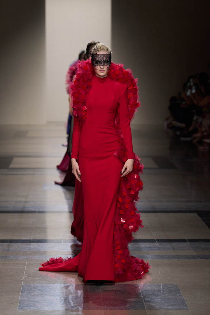 لا مانع من إضفاء بعض الحركة على إطلالتك الفخمة، وفي سبيل ذلك وجهي اختيارك نحو الفساتين الطويلة مستقيمة القصة المزودة بكابات مزدانة بالكشاكش مثل الفستان الأحمر الذي خطفت به عارضة جورج شقرا Georges Chakra الأنظار، لائميه مع غطاء وجه من الدانتيل الأسود مثلها لتطبعي اللوك بالغموض، وانتعلي حذاءً أحمرَ بكعب عالٍ، هنا سيكون الكلاتش الأسود اللمسة النهائية على تلك الطلة الفريدة.