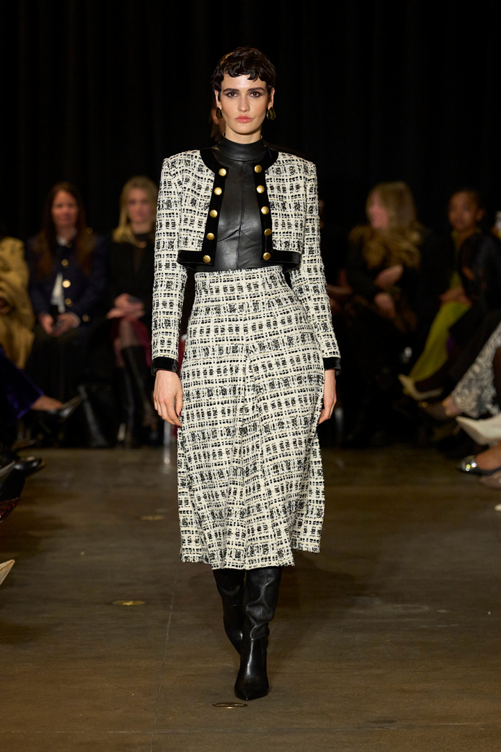 تتنوع أشكال التنانير المناسبة لجسم الساعة الرملية، ولكن ستظل الموديلات المصممة بقصة محددة لمنطقة الخصر والمستوحاة من شكل الكورسيه هي الأنسب، مثال على ذلك التنورة التويد الميدي المميزة بقصة A Line الموقعة من سيرجيو هدسون Sergio Hudson والمنسقة مع توب جلد وجاكيت كروب قصير من الخامة والنقشة نفسيهما، أكملي هذا اللوك الخريفي الأنيق ببوت أسود طويل، واحملي حقيبة كلاتش برغندية.