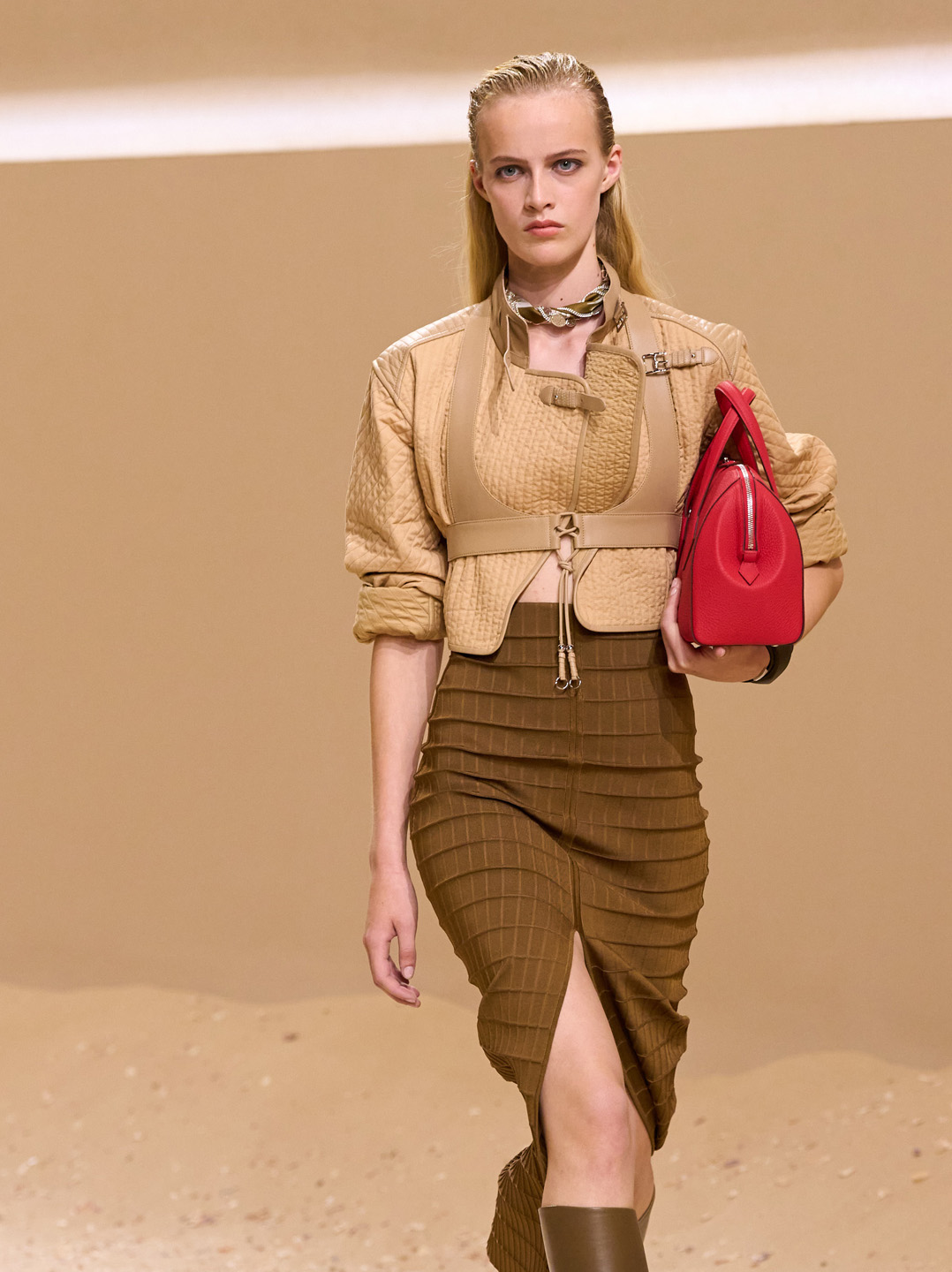 في مشهد طبيعي آسر، حيث يلتقي النهر بالبحر وتشكل الرياح ملامح الأرض، تطلّ فارسة حرة، متفلتة من القيود، تجسّد الانسجام مع البيئة وقوة الحضور الأنثوي. بهذه الصورة، تطلق دار هيرميس Hermès تشكيلتها الجديدة التي تمزج بين التقاليد العريقة والروح المعاصرة المستقلة. تستوحي المجموعة تفاصيلها من سرج كامارغي تاريخي محفوظ في أرشيف الدار، حيث ينعكس أثر الزمن والفرسان على ملامحه. هذا العنصر الرمزي يُترجم إلى تصاميم تحتفي بالحرفة اليدوية: جلد مشمّع يدوياً، حلقات معدنية، أحزمة وظيفية، وخياطة دقيقة مستلهمة من تقنيات الـBoutis التقليدية. تبرز القطع بتصاميمها الفريدة مثل الجاكيت القصير المصمم لحركة الفارسة، التنورة غير المتناظرة المصنوعة من كتان مبطن، والمعاطف الطويلة المربوطة بأحزمة تشبه تلك الخاصة بالسروج. في تناغم جريء بين الأنوثة والقوة، نرى الفساتين المشدودة المستوحاة من الكورسيه تُرتدى فوق سراويل رياضية، فيما تتحول أوشحة الحرير إلى قمصان أو عقود نحتية مبتكرة. تغوص التشكيلة في رمزية البحر والمرافئ، حيث السراويل المقتبسة من السلوبت البحرية، والتريكو الشفاف الذي يسمح لأشعة الشمس بملامسة الجلد، والطبعات الحرة التي تنساب على القماش كما الأمواج على رمال الساحل. في جوهرها، لا تعكس المجموعة الموضة فقط، بل تقدم حكاية نساء حرّات، متجذرات في أرضهن، يحملن روح الأجيال الماضية ويكتبن فصولاً جديدة من التمرد والأناقة. إنها دعوة للانطلاق، بلا قيود، في أفق واسع من الحرية والجمال.