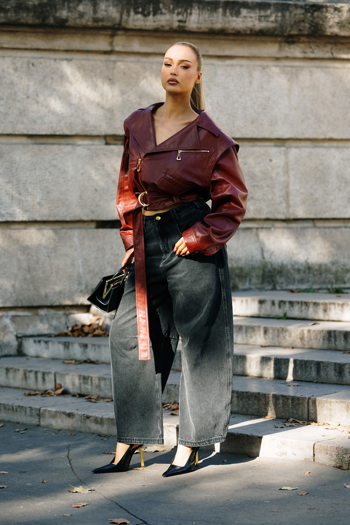 إذا كنت تملكين بنطلون جينز Barrel في خزانتك، فقد اختصرت الكثير للحصول على إطلالات كاجوال على الموضة هذا الخريف، وفي حال كان بنطلونك رمادياً داكناً، فهذا سيمكنك من تنسيقه مع مختلف الألوان الرائجة مثل الكاكي والبرغندي وحتى البني الداكن، ما رأيك في ارتدائه مع جاكيت جلد Cropped برغندي؟ ستكون الأكسسوارات السوداء المؤلفة من حقيبة هندسية الشكل وحذاء مدبب بكعب عال رفيع المتمم الأمثل لهذا اللوك الشبابي المميز.