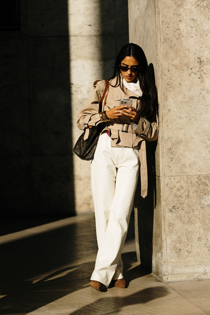 يبدو أن الترانشكوت القصير Cropped Trench Coat سيواصل تألقه هذا الموسم، القطعة التي حققت انتشاراً لا مثيل له الموسم الماضي ندعوك إلى عدم الاستغناء عنها، فالتنسيقات التي يمكن أن تبني عليها لا حصر لها، على سبيل المثال جربي تنسيقه مع كنزة بيضاء بياقة عالية وبنطلون جينز أبيض مستقيم القصة، وأكملي أناقتك الخريفية ببوت سويد جملي، واحملي حقيبة Tote بنية داكنة.