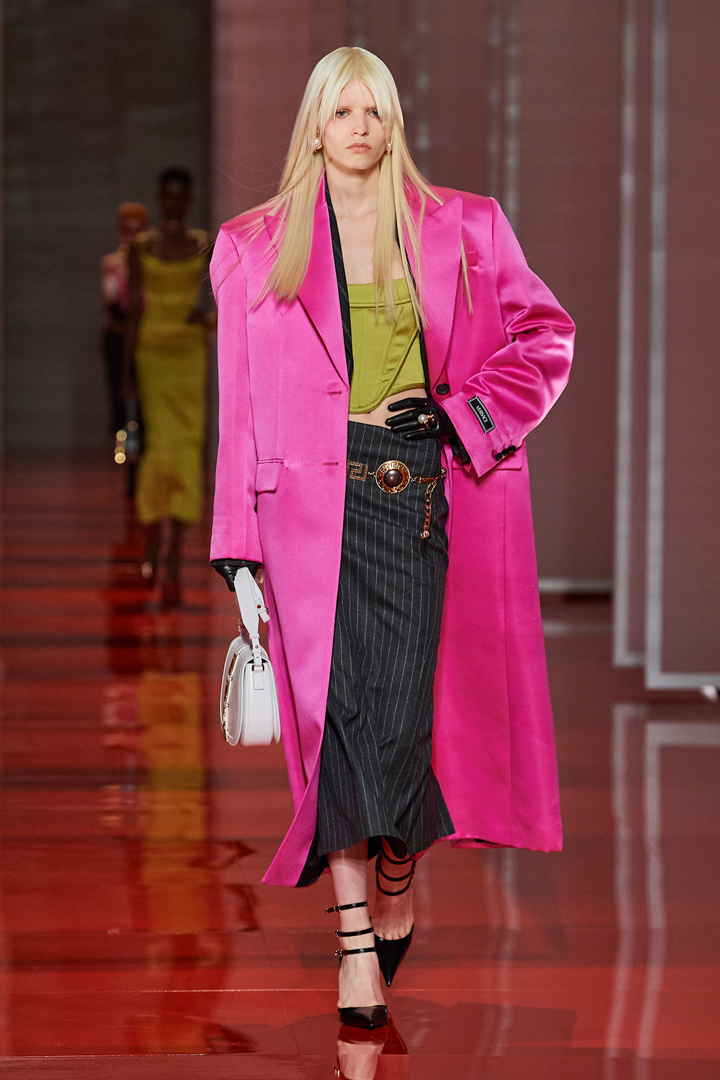لم يكتف فيرساتشي بتوظيف ألوان البوب في صياغة الفساتين، بل رصدنا في مجموعة خريف 2022 المعاطف الأوفر سايز الزهرية الصارخة والتي نسقت مع كروب توباً باللون الأخضر الفاتح وتنورة ميدي سوداء مخططة.