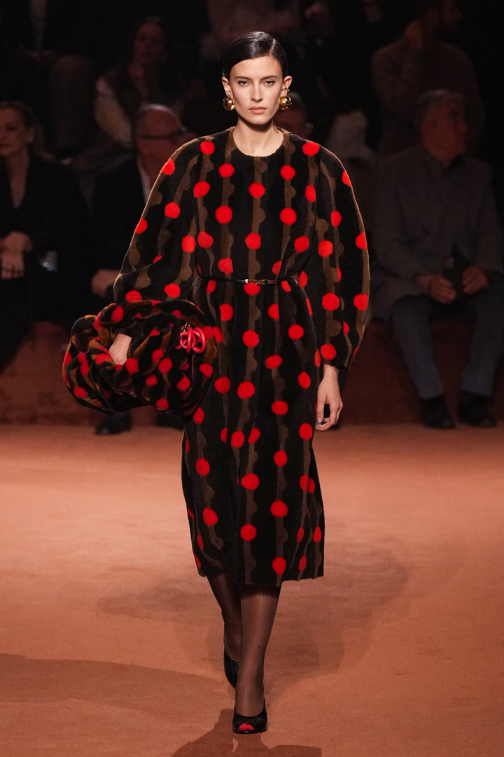 حظي الفراء بحضور غير مسبوق على مدارج عروض الأزياء الجاهزة لدرجة أن وظفه المصممون في تصميم الفساتين التي يمكن أن تكون بديلاً أنيقاً لأزياء السهرة التقليدي، لذا نقترح عليك التفكير في الفستان الميدي الذي جمع بين اللون الأسود والبني الداكن والأحمر الذي أطلت به عارضة ماركة فندي Fendi، نسقيه مع حذاء أسود مدبب وحقيبة كتف صغيرة حمراء مزودة بسلسال ذهبي، وارتدي أقراط Studs متوسطة الحجم من الذهب الأصفر.