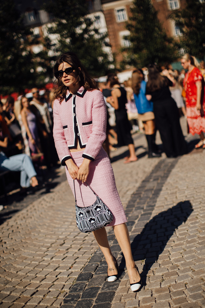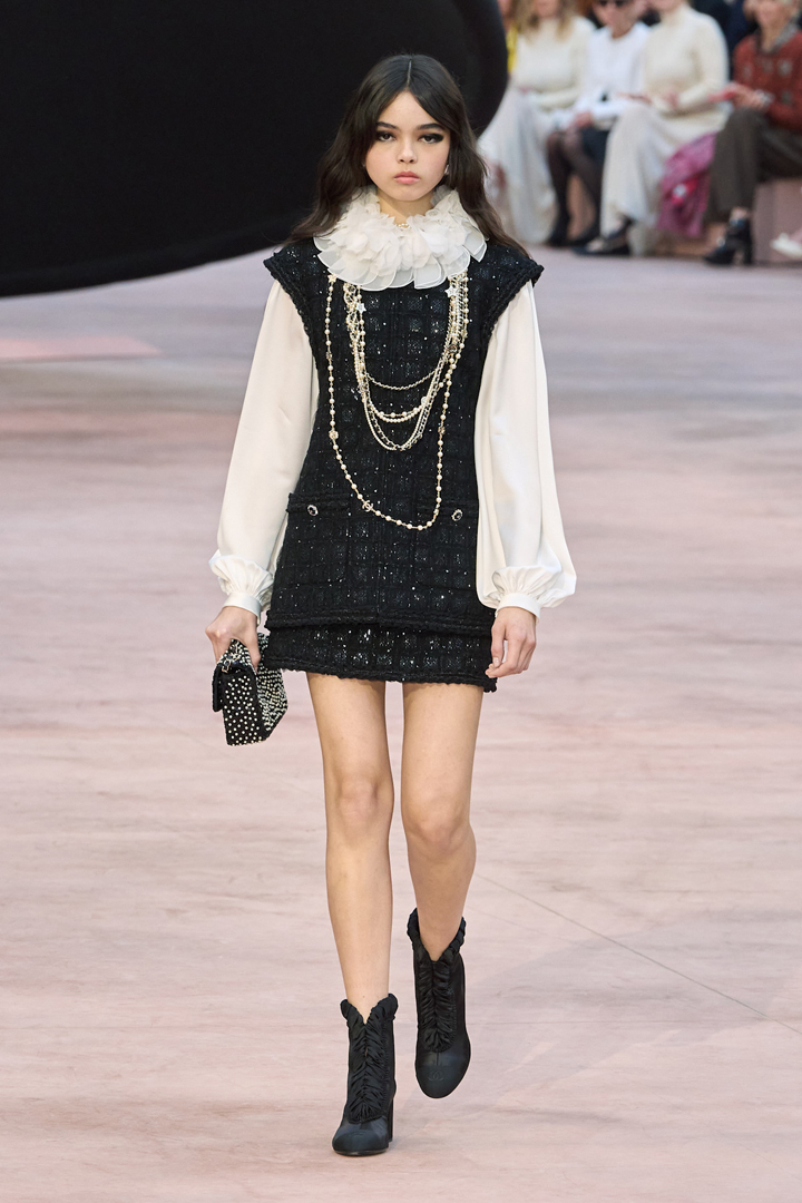 البديل المناسب: بما أننا نتحدث عن التويد، فكانت الأولوية لدار شانيل Chanel عند بحثنا عن القطعة التي سنرشحها لكِ، فانتقينا هذا التايير الأسود القصير المنسق مع بلوزة شيفون بيضاء بياقة مرتفعة على هيئة طبقات مكشكشة، أكملي الطلة مثل العارضة؛ ببوت قصير وحقيبة صغيرة.