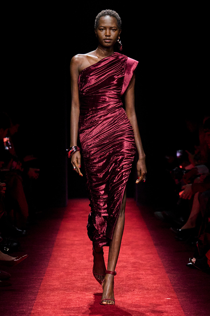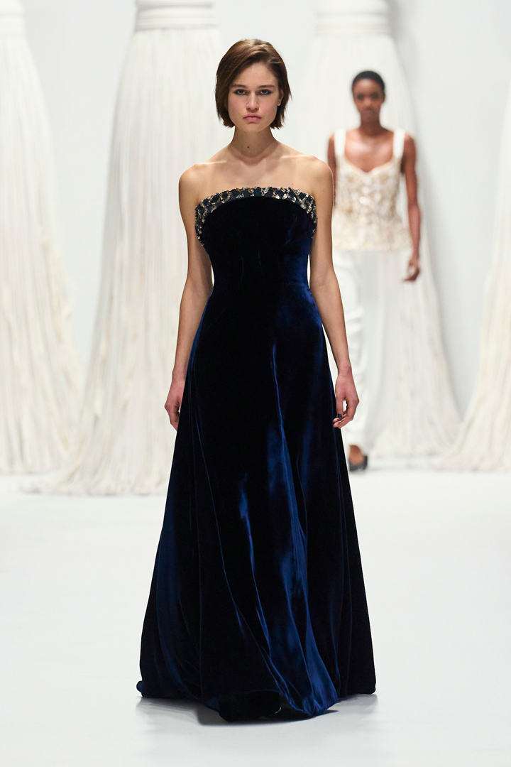 كما تعلمين فإن المخمل كان الأكثر حضوراً على خشبات عروض شتاء 2025، الخامة التي تثبت موسماً تلو الآخر أنها ستبقى متمسكة بمكانها لسنوات قادمة، رصدناها في عرض المصمم إيلي صعب Elie Saab، فقد تألقت إحدى عارضاته بفستان أسود طويل ديكولتيه يكشف الكتفين، تميز بموديله المستوحى من شكل حورية البحر والتطريز المتقن باللون الأخضر الداكن الرائج، وقد نسق مع قفازات الأوبرا الطويلة المصنوعة من الجلد الفاخر، ولمزيد من الثراء، انتعلي حذاءً مدبباً أسود سادة، واحملي كلاتش صغيراً أسود أو باللون الأخضر الزمردي، وارتدي قلادة ناعمة من الذهب الأبيض المرصع بالألماس والزمرد، لائميها مع أقراط قصيرة من نفس النمط.