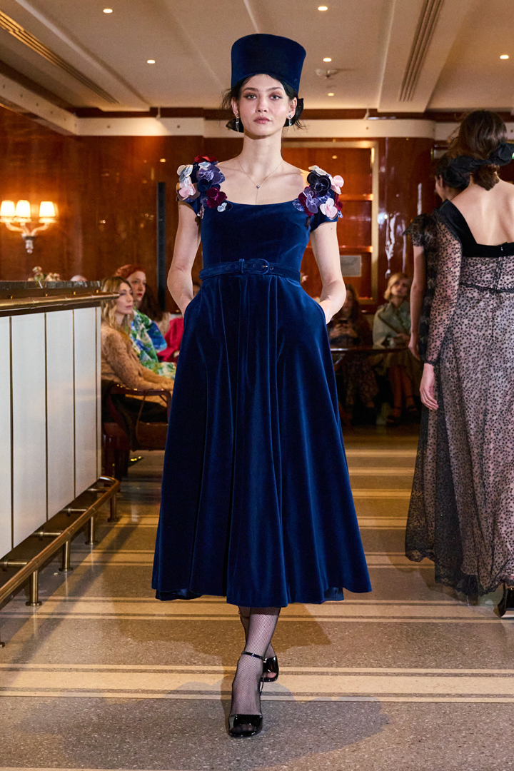 أما في حال كنتِ ترغبين في إطلالة أكثر نعومة؛ فهنا نرشّح لكِ الفستان الأزرق الداكن المنفوش، والمصمم بحمالات عريضة مغطاة بالورود من مجموعة ماركة لويزا بيكاريا Luisa Beccaria، لائميه مع حذاء أسود مزوّد بإبزيم يزيّن الكاحل على غرار العارضة، واحملي كلاتش برغندي. أما المجوهرات فيفضل أن تكون ناعمة ومن الذهب الأبيض.