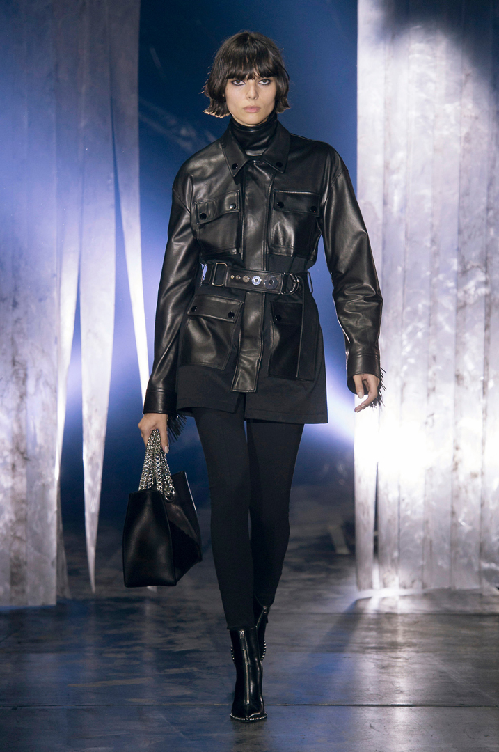 من عرض خريف 2017 انتقينا لك هذا اللوك العصري المرتكز على فخامة الأسود الملكي والجاكيت المطعم بالجلد اللامع مع تفاصيل معدنية ضاعفت من جماله، كل هذا منسقاً مع بنطلون Leggings أسود وبوت متوسط الطول بسحاب أمامي وحقيبة هندسية الشكل مزودة بسلسال طويل يمكن تعديل طوله، صورة تلخص المدرسة الأمريكية القائمة على الأسلوب الرياضي المدموج بالقطع اليومية.