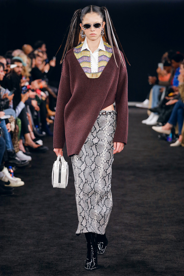 يتجلى كل ما سبق في الإطلالة التي اخترناها من مجموعة خريف 2019، فقد ظهرت إحدى العارضات بقميص بولو مزخرف منسق مع تنورة ميدي مستقيمة القصة مطبعة بنقشة الأفعى، والكنزة البنية الطويلة جاءت لتخفف من جرأة اللوك خاصة مع البوت الأسود والحقيبة البيضاء، الستريت ستايل كما يجب أن يكون.