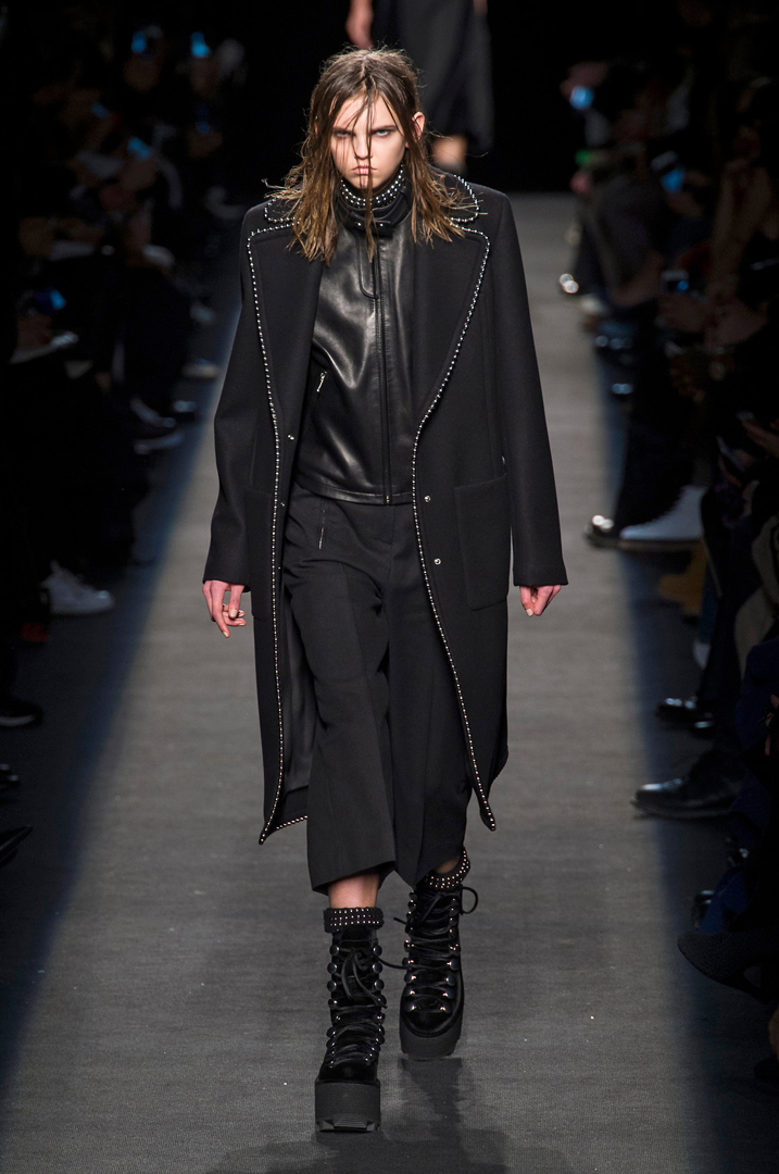 أبسط مثال على ذلك الإطلالة التي جلبناها لك من مجموعة خريف 2015 والمؤلفة من بنطلون برمودا واسع وسترة جلد زوّدا بمعطف ميدي مطرز على الحواف، هي حرفياً صورة تجسد مهارة ألكسندر وانغ في دمج تضادين، أزياء يومية مع تفاصيل من عالم الأزياء الفاخرة.