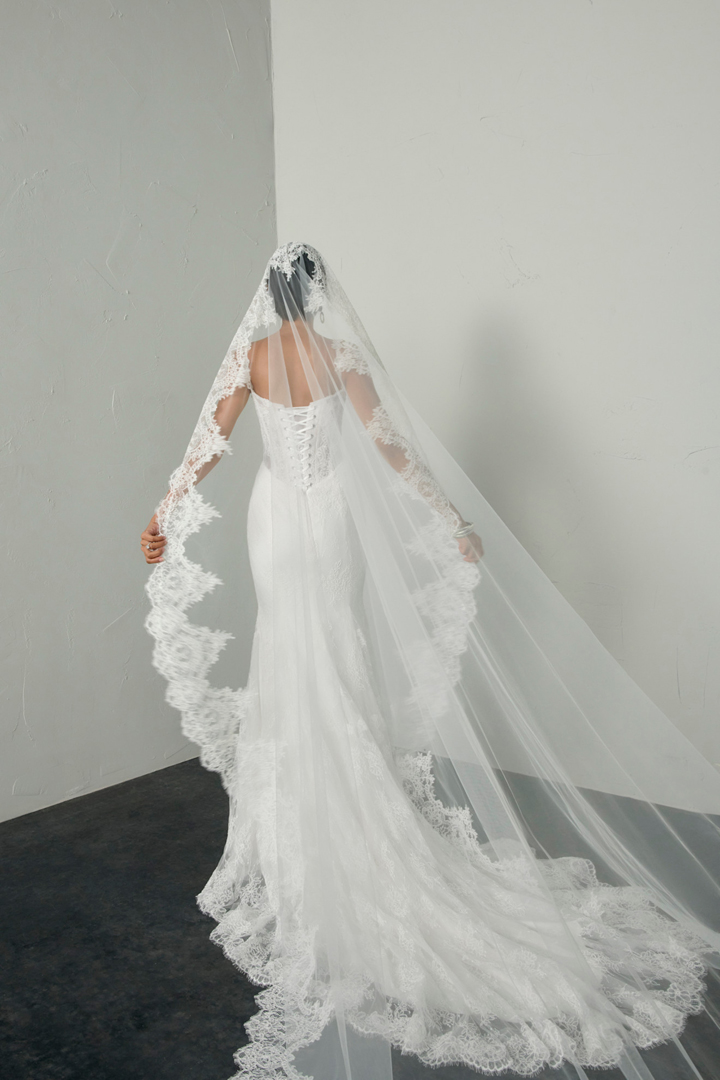 إذا كنتِ تميلين إلى الإطلالات الأميرية وترتبين لحفل زفاف فخم في أحد الفنادق أو القصور الكبيرة، فبالتأكيد ستُعجبكِ موضة طرحات العروس الطويلة، والتي تصل أحياناً إلى الأرض وتتساوى مع ذيل الفستان الطويل، وقد برعت ماركات كثيرة في تنفيذها، ولكننا أحببنا على وجه الخصوص الطرحة الشيفون المزدانة بالدانتيل على الحواف، والموقعة من ماركة جاستن ألكسندر Justin Alexander، والتي أتت لتكمل الفستان الكورسيه الرائج بشكل رائع، خاصة أنه يأتي مع ذيل متوسط الطول.