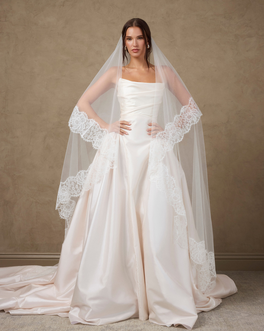 هل تذكرين الطرحات الدانتيل ذات الأطوال المتدرجة التي كانت سائدة في التسعينيات؟ لقد عادت لتتصدر المشهد، ونتوقع من الآن أن تكون نجمة حفلات زفاف 2026، ستحبين مثلنا الموديل الشيفون الناعم المطرز بدانتيل على الحواف من تشكيلة كاثرين تاش Katherine Tash، والذي نسّق مع فستان ديكولتيه سادة ناعم بتوب مصمم على طراز الكورسيه وتنورة منخفضة الخصر، أضيفي عليه لمسة ثراء عبر مجوهراتك المرصعة، فيفضّل هنا ارتداء قلادة ناعمة من اللؤلؤ أو الذهب الأبيض المرصع بالألماس.