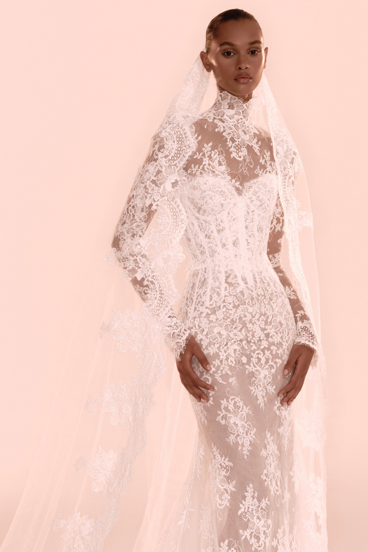 مثل الفساتين تماماً، من الضروري عند اختيار طرحة العروس أن يوضع في الاعتبار شكل حفل الزفاف المخطط له ومكانه، فلا داعي مثلاً إلى المشي بطرحة كبيرة تمتد إلى الأرض في حفل داخل المنزل، هنا ستكون الطرحات القصيرة ومتوسطة الطول الخيار الأمثل، لذا نرشح لكِ التصميم المصمم بالكامل من الدانتيل من تشكيلة زهير مراد Zuhair Murad، لقد أكمل بشكل رائع جمال الفستان المنفذ من الخامة نفسها، والمميز بياقته العالية.