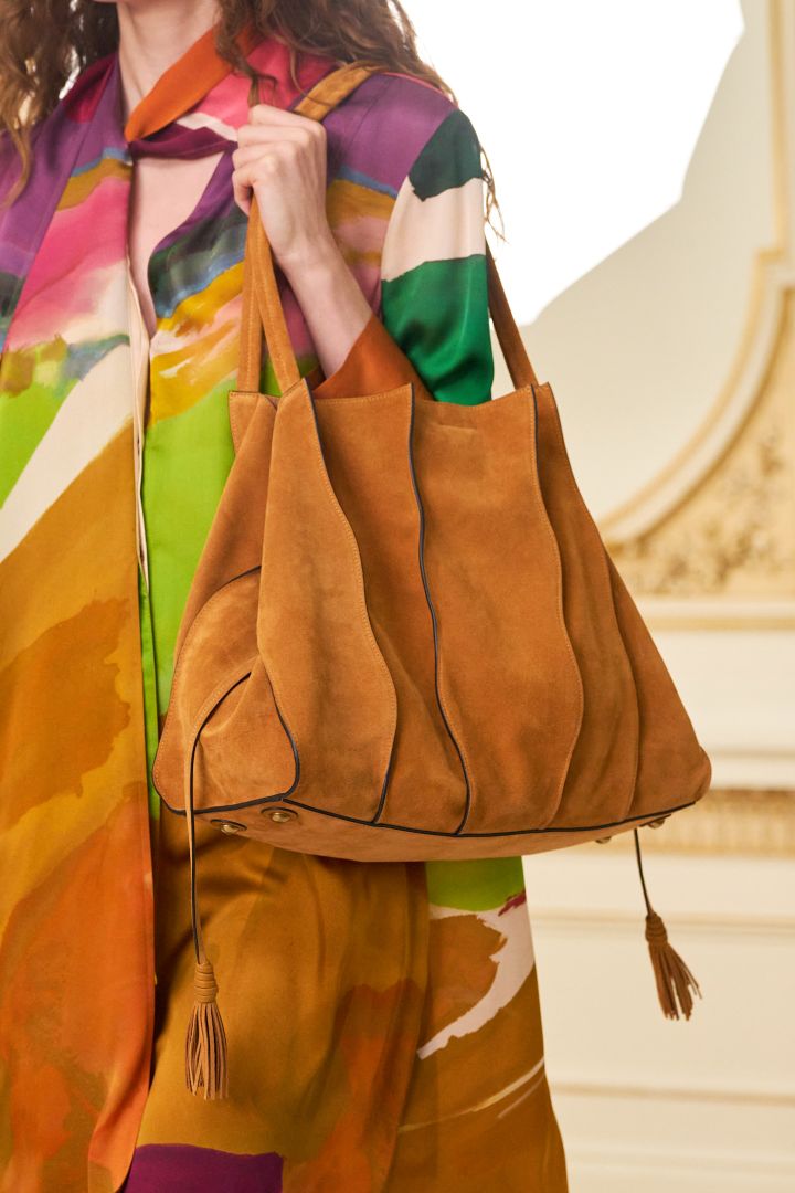 أكريس Akris- الصورة من Launchmetrics/Spotlight © - حقيبة الشامواه بالتصاميم المريحة والفضفاضة، وهي وحقائب العمل الكبيرة، والتي تتسم بالأشكال المستوحاة من الطراز القديم مثل حقائب البولينغ، وابتعدي عن الحقائب الصغيرة جداً.