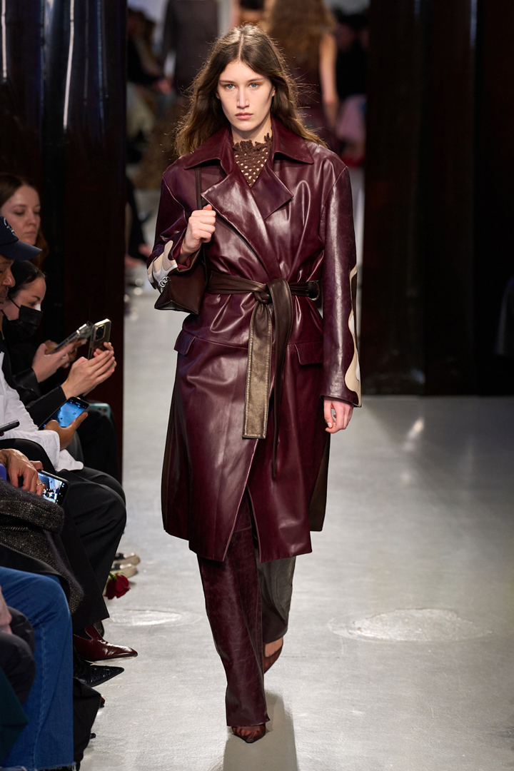 صادفنا المعاطف الجلدية في الكثير من العروض العام الماضي، ولكن الملاحَظ أن أغلبها جاء بأطوال متوسطة لا تتخطى منتصف الساق؛ فأحببنا المعطف البرغندي عريض الياقات والمزوّد بحزام يحدد الخصر، من تشكيلة ماركة كريستوفر إسبر Christopher Esber. نسّقيه مثل العارضة مع سروال جلد من اللون نفسه؛ لتحصلي على إطلالة مونوكرومية تطيل قامتكِ. أو جرّبي ارتداءه مع كنزة سوداء أو برغندية وسروال جينز أزرق، وتممي اللوك ببوت برغندي وحقيبة باللون الكاكي أو الأسود.