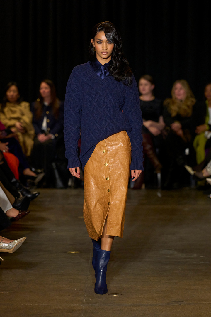 سعياً لإرضاء كافة الأذواق، أدرجت الماركات العالمية تشكيلة منوّعة من أجمل التنانير الجلدية؛ فرأينا التنانير مستقيمة القَصة ذات الأطوال المتوسطة والألوان الحيوية في عرض سيرجيو هدسون Sergio Hudson، وأحببنا على وجه الخصوص الموديل الجملي الفاتح المزوّد بأزرار ذهبية من الأمام. نسّقيه على غرار العارضة مع كنزة محبوكة باللون الكحلي، نسّقت معها قميصاً وربطة عنق وبوت متوسطَ الطول من اللون نفسه. أكملي اللوك الشتوي الأنيق بحقيبة Crossbody باللون الجملي.