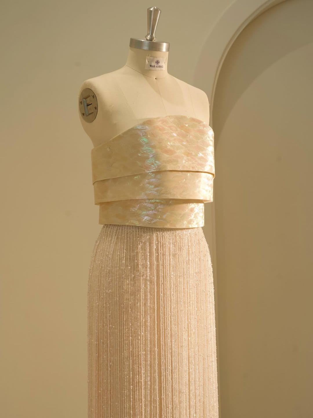 بدأ التعاون منذ نحو خمسة أشهر من خلال منسقة أزياء بيري، هيذر بيتشيوتينو، وتطور من خلال عملية قياس دقيقة، مع إيلاء اهتمام واضح للحفاظ على أصالة التصميم. كانت العملية احترافية ودقيقة، مما سمح بتنفيذ القطعة تماماً كما هو مخطط لها، من دون المساس بجودتها العالية. القطعة مصنوعة يدوياً بالكامل، واستغرقت أكثر من خمسة أشهر من العمل الدقيق. الجزء العلوي منحوت من صفائح عرق اللؤلؤ المصنوعة يدوياً، حيث تم قص كل طبقة وصقلها على حدة لخلق سطح أملس ولامع. بعد صقلها بورق صنفرة لؤلؤي وختمها بشمع طبيعي، تعكس المادة الضوء في حركته، وتُلصق حرارياً بالقماش لتحقيق توازن بين البنية والانسيابية. يتميز الجزء السفلي بخيوط عمودية من اللؤلؤ الطبيعي وقطرات الكريستال، وُضعت يدوياً بتشكيل إيقاعي لتعكس الحركة المتحكم بها والضوء.