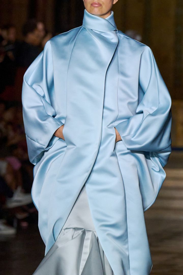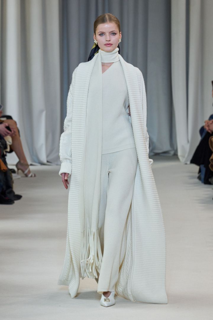 لدى ذكر معطف الوشاح نستعيد بالذاكرة ما صممه جان بول غوتييه لدى هيرميس Hermes في حقبة الثمانينيات؛ إذ يُعَدُّ معطف الوشاح أحد أبرز اللحظات البسيطة والآسرة التي برزت من الدار، والتي رفعت معايير الكشمير إلى مستويات عالية جداً. وقد استلهمت علامات تجارية أيقونية، من ماري لينغ وبرابال غورونغ ولورا بياجيوتي، هذا التصميم أيضاً. لقد شهدنا هذا العام إقبالاً من مصممي الأزياء على تصميم المعاطف الأنيقة، بأشكل وقصات متنوعة. أعجبتني هذا الموسم من هيرميس معطف الوشاح السميك المزود بوشاح من الفرو العاجي، ويتسم بقصته المتقنة التي تُناسب الملابس الخردلية الكاميل ويمكن تنسيقه مع كنزات محبوكة، وهو معطف قصير يضفي لمسة أنيقة على إطلالة ترافقك من الصباح إلى المساء. كما أعجبتني النسخة الطويلة الكلاسيكية لدى دار ماري لينغ MaryLing من معطف الوشاح الرمادي الأنيق المتصل بوشاح يمكن عقده على شكل فيونكة كبيرة مع تنسيق أكسسوارات حمراء معه.