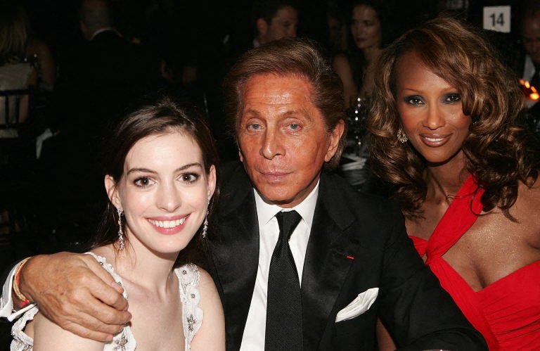 المصمم فالنتينو غارافاني بين العارضة إيمان والنجمة آن هاثاواي- مصدر الصورة Evan Agostini / Getty Images via AFP)