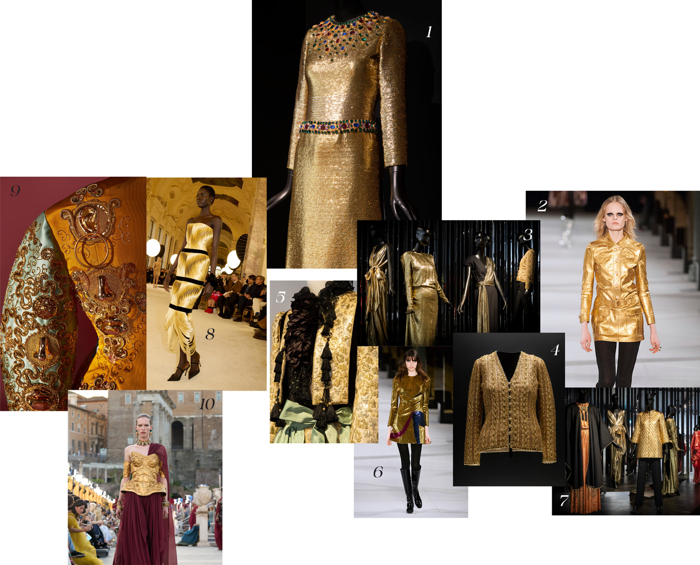 كان القماشُ الذهبي، أو الفضي، يُصنَعُ بلفِّ سلكٍ معدني رفيعٍ حول خيطٍ حريري، ما يجعله أكثر مرونةً للنسج، وكانت هذه الخيوطُ تُمرَّر عبر القماش، ما يمنحه لمعاناً رائعاً، ويُذكَرُ هنا أن أهلَ مدينةِ سيينا كانوا مشهورين بحبِّهم للديباجِ الذهبي الفاخر. وفي مرحلةٍ ما، هاجمَ إدوارد الثالث، ملكُ إنجلترا، «الملابسَ الفاحشة»، وحصرَ ارتداءَ قماشِ الذهب بعائلاتِ الملوك، لكنَّ هذا القماش، لم يكن مجرَّد عُرفٍ للأزياءِ الملكيَّة فحسب، بل وكان أيضاً تكريساً للمناسباتِ المهمَّةِ كما في حفلِ تتويجِ الملك ريتشارد الثالث عامَ 1483.وعموماً، يحتفي الذهبُ بإنجازاتنا البشريَّة، لذا من الطبيعي أن نراه على شكلِ تاجٍ ذهبي، أو ميداليَّةٍ، أو جائزةِ أوسكار، أو نجمةٍ ذهبيَّةٍ على رصيفِ هوليوود ، ولا ننسى أكاليلَ الغار الذهبيَّةَ اليونانيَّةَ التي يعودُ تاريخها إلى القرنَين الثالث والثاني قبل الميلاد، وهي تيجانٌ رائعةٌ من الذهبِ، والبلاتين، والألماس من تصميمِ فولكو دي فيردورا Fulco di Verdura، إلى جانبِ فستانِ ديور Dior الذي يعودُ إلى عامِ 1949، وأُطلِقَ عليه Divine Dior Junon Dress. وهناك فستانُ Egalité من ديور Dior المزيَّنُ بالريشِ والذهب من تصميمِ ماريا جراتسيا كيوري Maria Grazia Chiuri، الذي ارتدته الفنَّانةُ وكاتبةُ الأغاني آيا ناكامورا Aya Nakamura في حفلِ افتتاحِ أولمبيادِ باريس Olympic Games 2024.