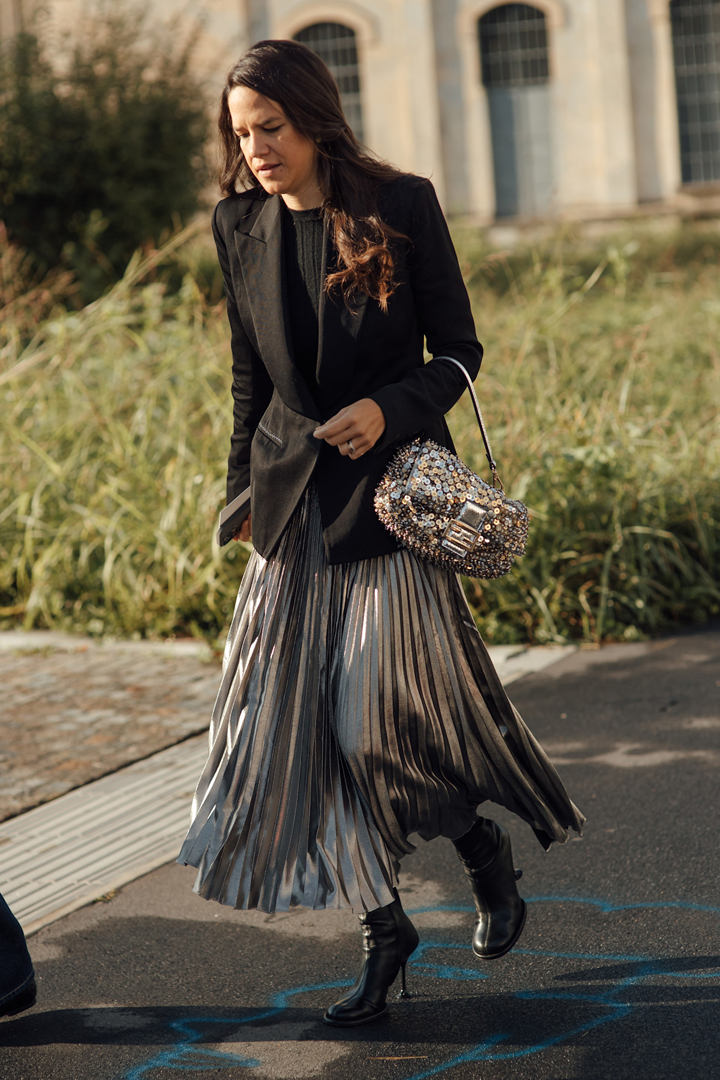 إذا كنت تميلين إلى الإطلالات الهادئة ولكنك ترغبين في تبني موضة الألوان الميتاليكية الرائجة؛ فجربي التنانير الميدي البليسيه اللامعة، فمثلاً ارتدي موديلاً فضياً ولائميه مع توب أسود وبليزر طويل من اللون نفسه، وانتعلي بوتاً أسودَ طويلاً بكعب مقوس على الموضة، وتممي أناقتك بحقيبة Baguette فضية أو سوداء مرصعة بترتر فضي، وزيني أذنيك بأقراط متدلية متوسطة الطول من الذهب الأبيض.