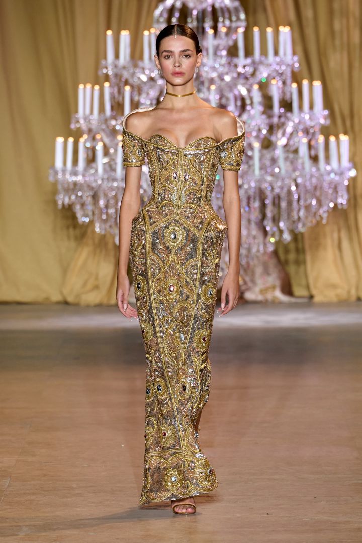 استمد إيلي صعب إلهامه من التراث والتاريخ، وهو تاريخ شخصي، يعيدنا إلى بدايات صعب بفساتينه المطرزة بدقة بألوان ذهبية بكافة تدرجاتها من الذهبي الأصفر والوردي والكروم والنحاسي، الذي يغلف أو يشكل قاعدة الأحجار الكريمة والقصور البيزنطية العريقة. كان هناك عدد هائل من القطع الرائعة، ومع ذلك، بدت لنا بعض الفساتين مألوفة وهي الفساتين المصنوعة يدوياً بتطريزاتها الجميلة، وتطريزات الدانتيل والغيبور الرقيقة، وتطريزات الخرز الذهبي والفضي المذهلة. كانت الفساتين واسعةً بقصة أميرية أو طويلة منسدلة تكاد تصل إلى الأرض، وتضمنت المجموعة فستاناً ذهبياً منفذاً من الريش البراق فاق التوقعات بتطريز متقن استهلك مئات الساعات من العمل الدؤوب على يد حرفيين مقربين من صعب كعائلته.