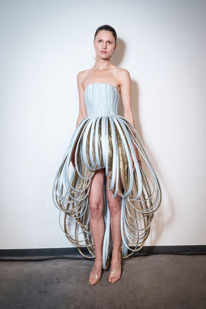 كما نفذ المصمم الفستان الباستيل الأزرق والمنفذ بحبال على شكل أقواس لتغطي القماش الميتاليكي الذهبي، وتتميز تنورته المنفوخة بقصة غير متجانسة تبدو قصيرة من الأمام وتنسدل بقصة أطول من الخلف.