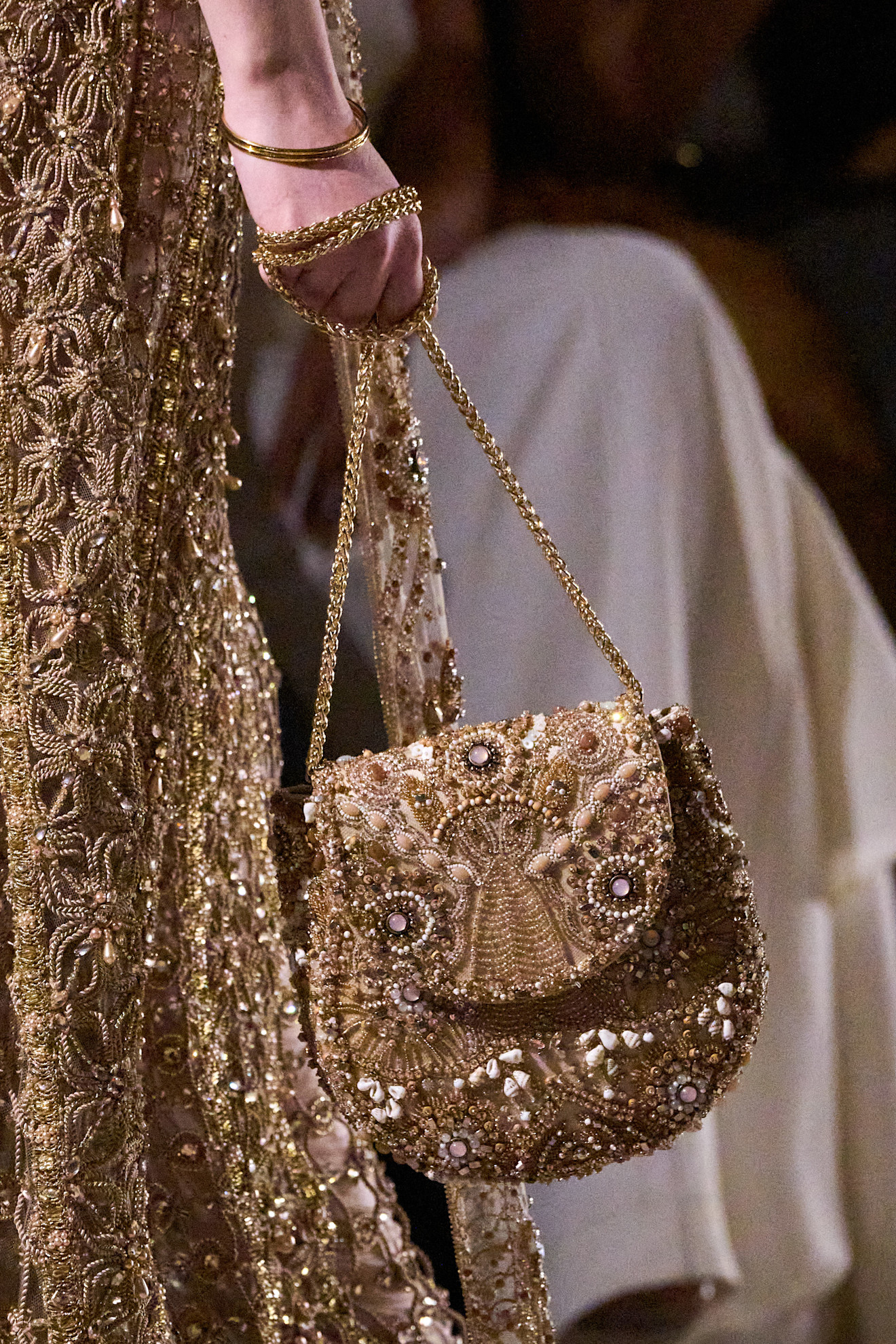 فيما جاءت حقيبة إيلي صعب Elie Saab بتصميم فخم مغطى بالتطريزات الذهبية، المرصّعة بالخرز واللآلئ الدقيقة، وأضافت السلسلة الرفيعة باللون الذهبي لمسة أنثوية ناعمة، وتمنح الحقيبة طابعاً كلاسيكياً فخماً.