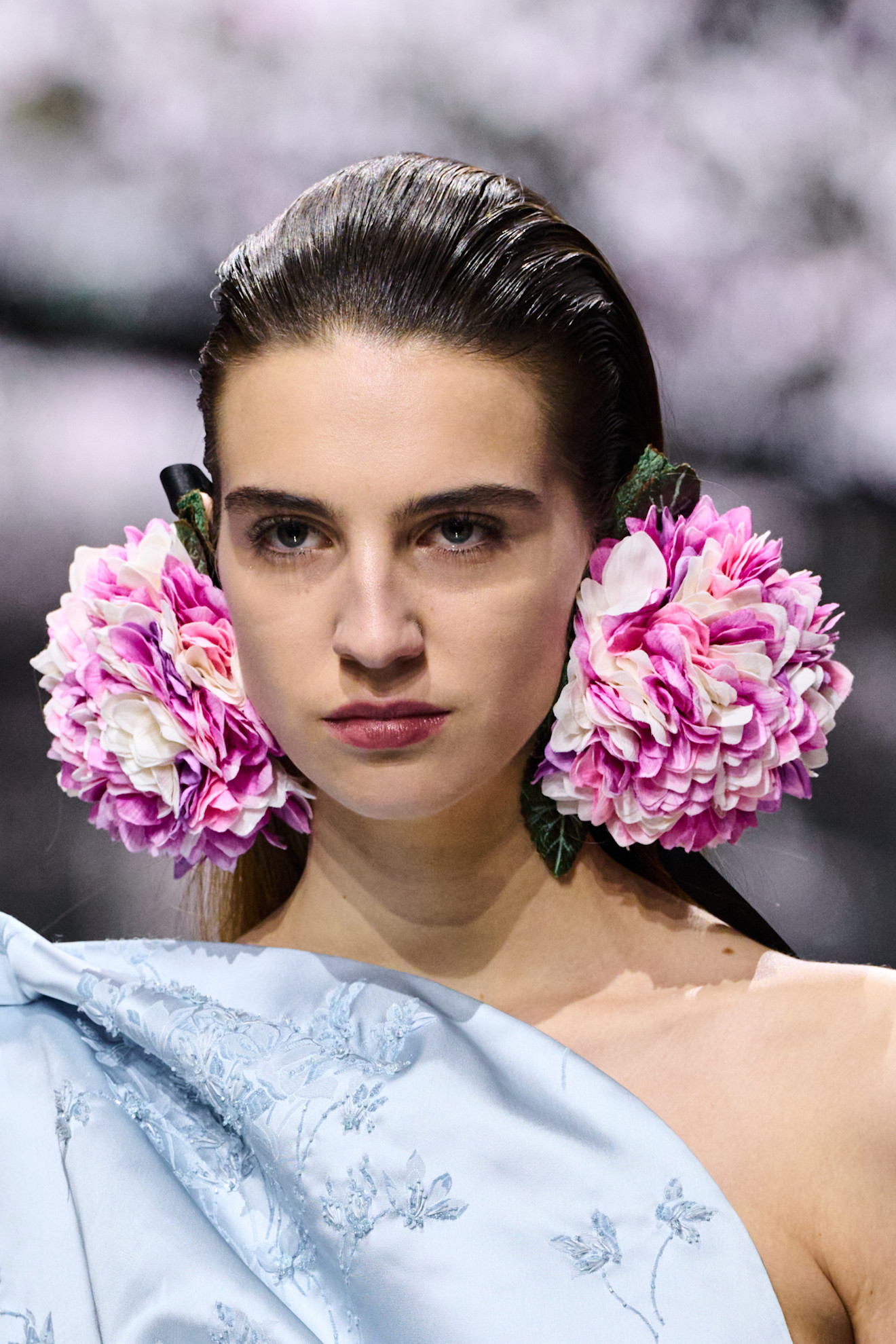 أما دار كريستيان ديور، Christian Dior فذهبت إلى أقصى درجات الجرأة بأقراط على شكل زهور الفاوانيا العملاقة باللونين الوردي والأبيض، غطت جانبي الوجه وكأنها قطعة من حديقة غناء.