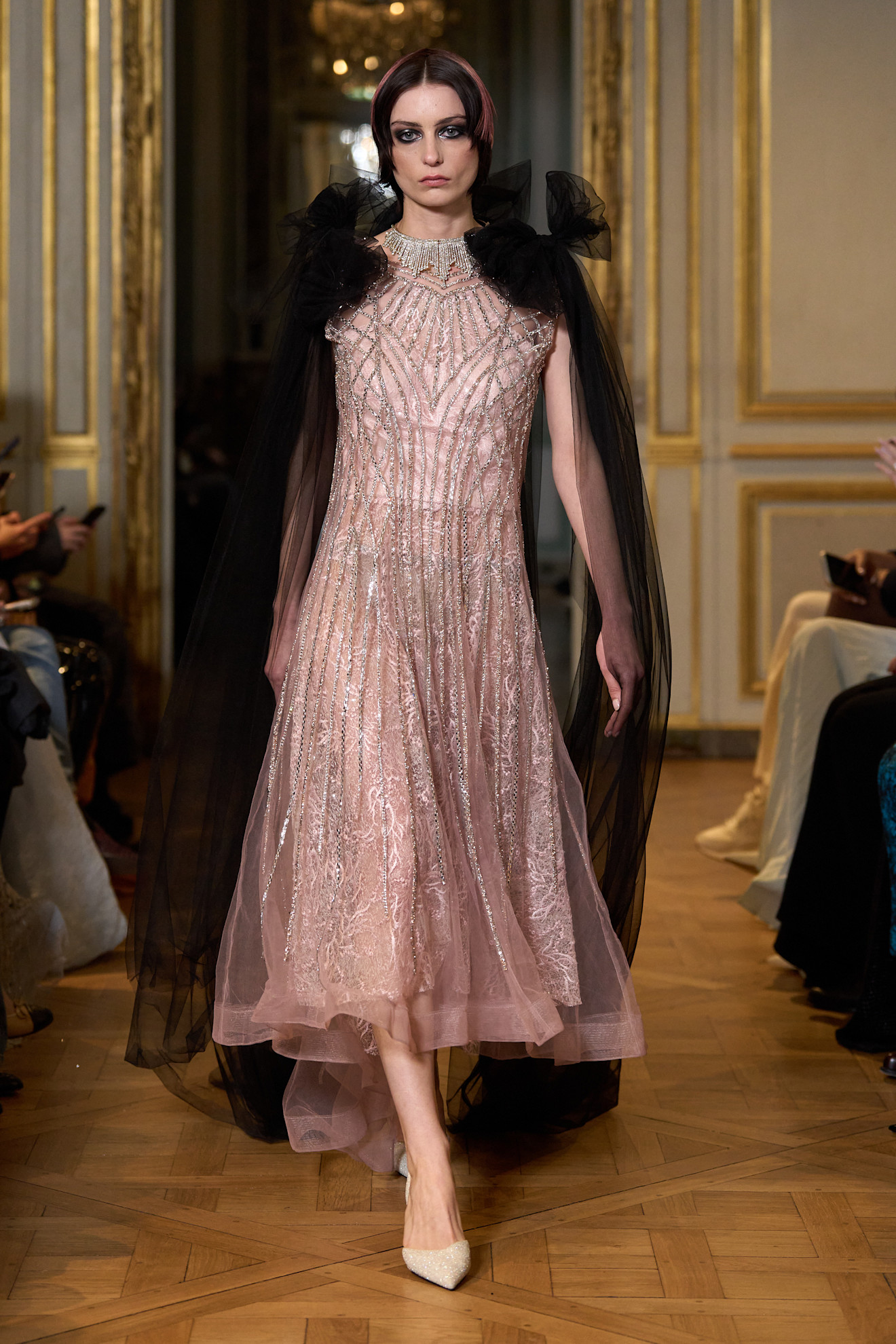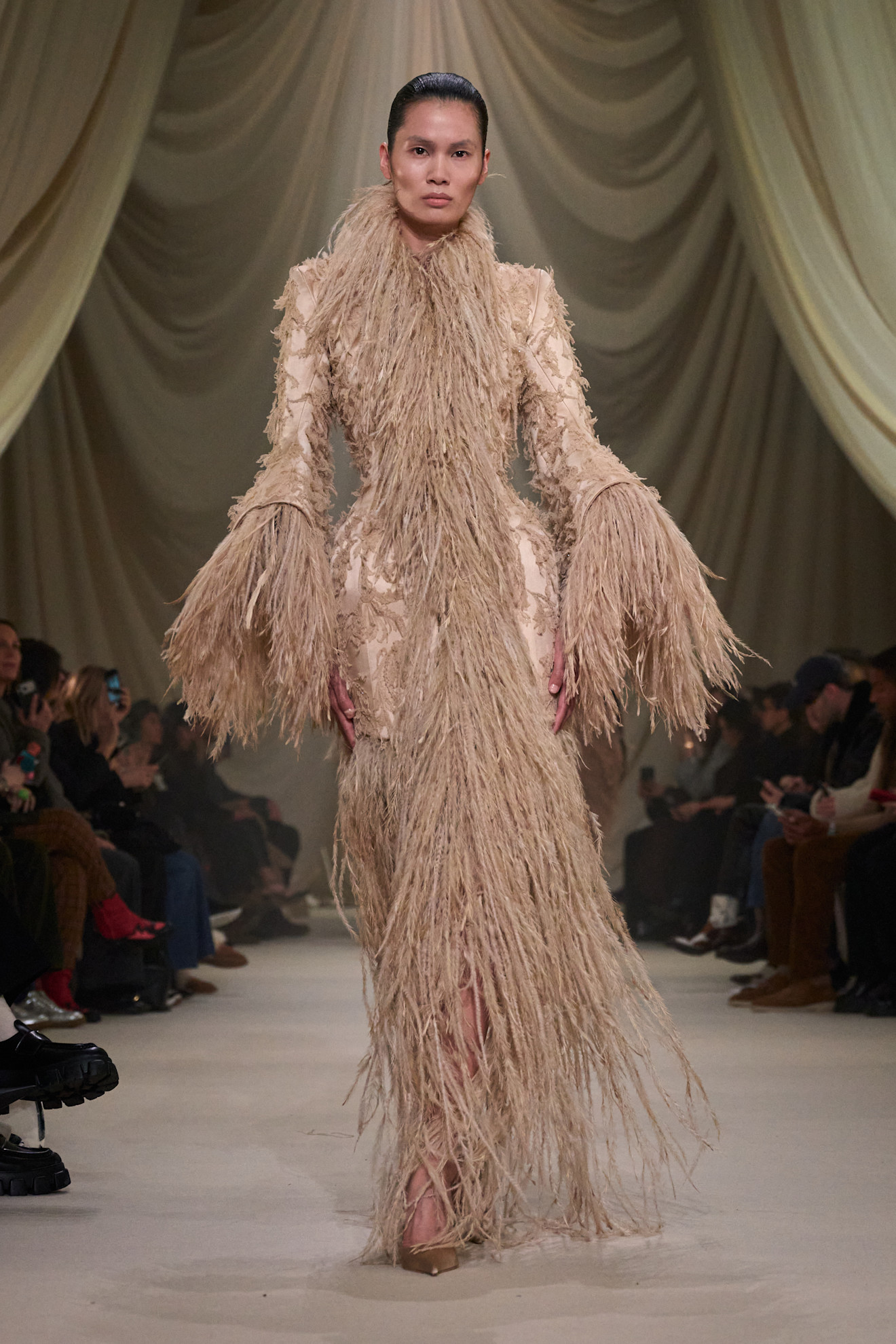 افتتحت ليزا رينا العرض بإطلالة مسرحية جريئة، في حين تنقلت المجموعة لونياً من الداكن إلى الفاتح، مع تطريزات كثيفة ذات أشكال شوكية مستوحاة من أعمال الفنان H.R. Giger. برزت المعاطف الريشية الضخمة، وفساتين لامعة، إلى جانب أولى محاولات المصمم في أزياء العرائس، التي جاءت قوية بصرياً على الرغم من الجدل حول بعض تفاصيلها.