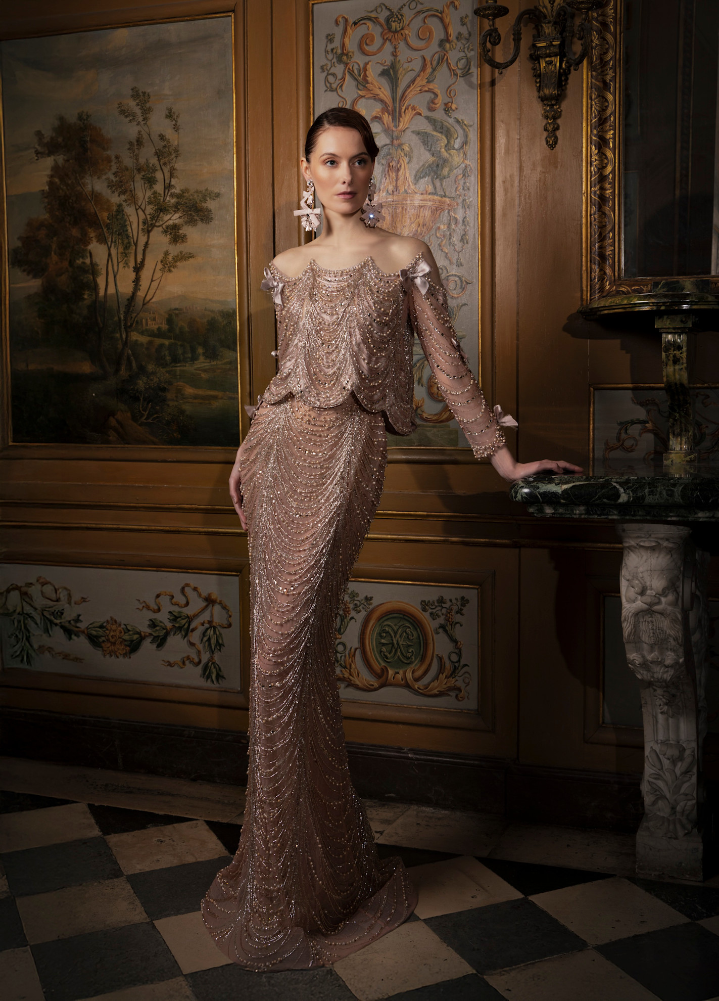 جاءت المجموعة غنية بالتفاصيل، حيث تناغمت تدرجات الوردي، الذهبي، الفضي، الأبيض، مع لمسات من الأزرق والبني، فيما أضفت التباينات الجريئة بعداً درامياً راقياً. لعب الكورسيه دوراً محورياً في التصاميم، إلى جانب أقمشة فاخرة مثل الأورغنزا، الموسلين، والتول المطرز يدوياً بالكريستالات والأحجار اللامعة. واكتملت الإطلالات بلمسات من الريش واللؤلؤ والتطريزات ثلاثية الأبعاد، لتتحول كل قطعة إلى حكاية أنيقة تحتفي بالأنوثة الملكية بروح معاصرة.