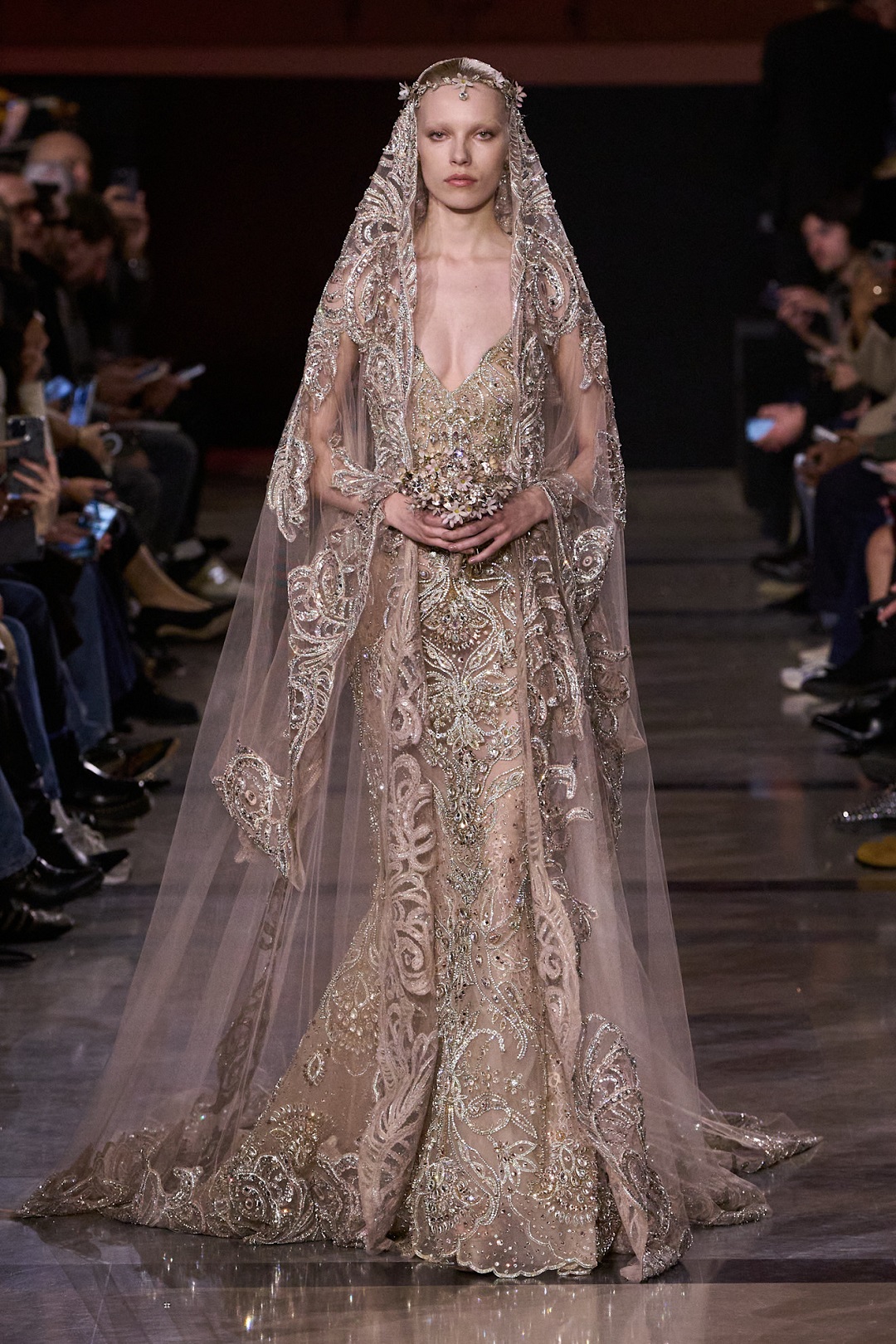 كالعادة، حمل توقيع إيلي صعب طابع الدراما والرومانسية الخالدة. الفستان جاء بقصّة حورية البحر، ليبرز قوام المرأة بطريقة أنثوية راقية. التطريز الكامل بالخرز الذهبي النحاسي منح التصميم بريقًا فخمًا، بينما انسدلت الطرحة الطويلة على كلا الجانبين، مزينة بخيوط ذهبية من الأطراف، لتجسد مفهوم العروس الملكة في أسبوع الموضة في باريس ربيع 2026.
